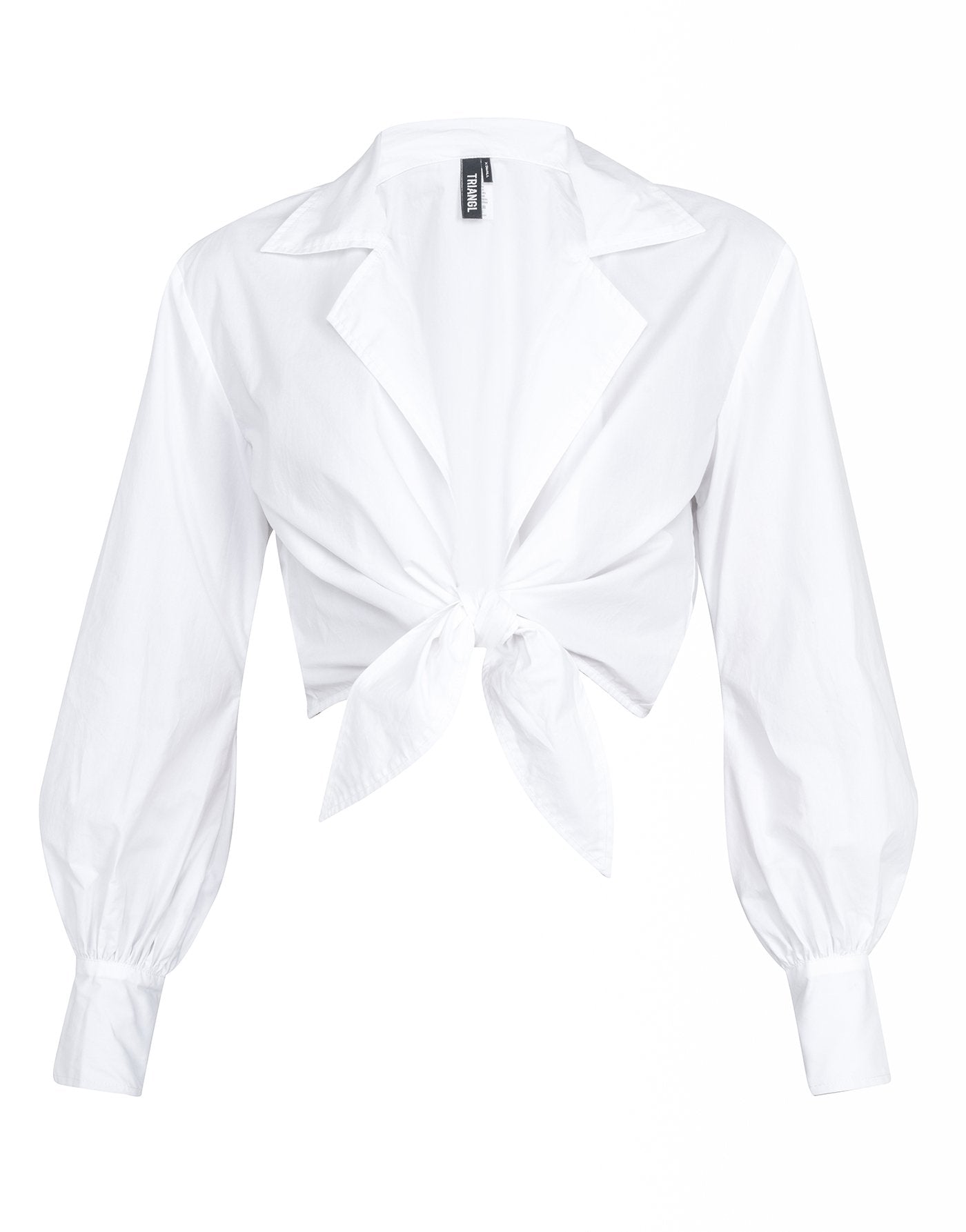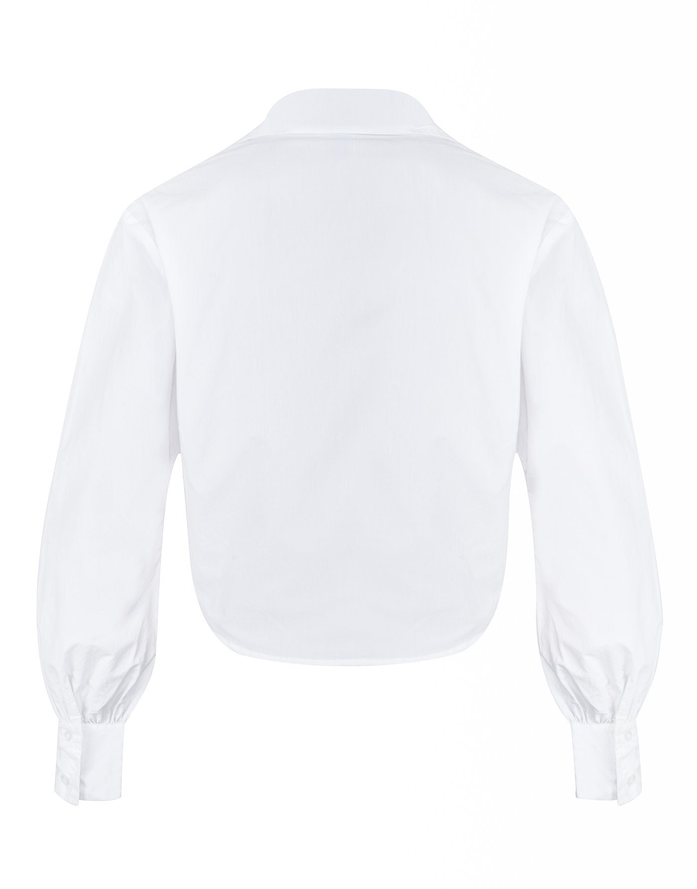 Long sleeve cotton crop shirt in white. Featuring an open point collar, deep V-neckline and self tie knotted front.