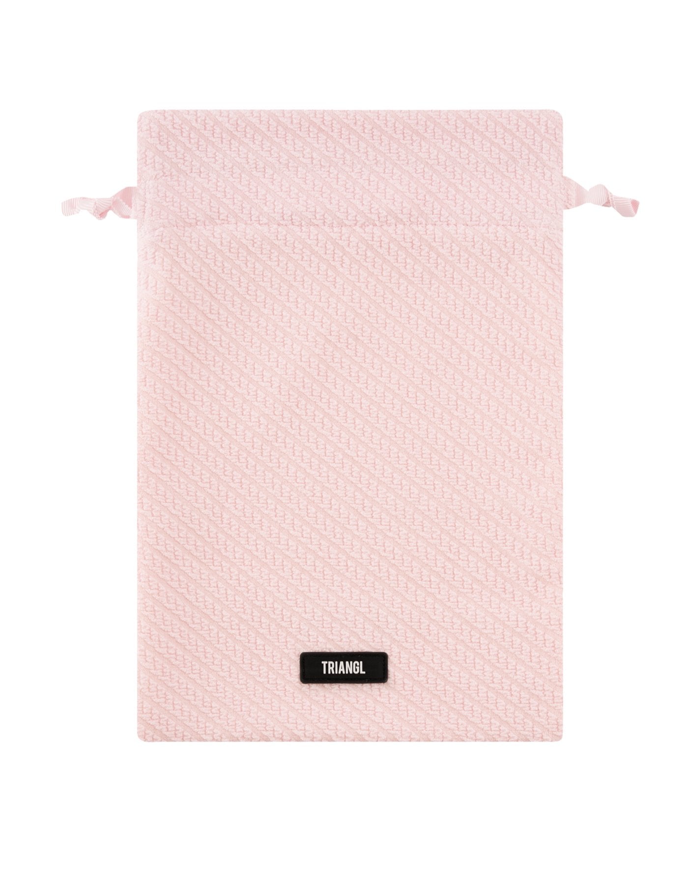 Knot style top with matching high rise bottoms in a baby pink textured pattern fabric. Featuring a padded cup with adjustable shoulder straps and back clasp fastening. The high rise bottom is designed to sit at your natural waist line with a higher cut at the leg. This bikini also comes with a matching drawstring dust bag.