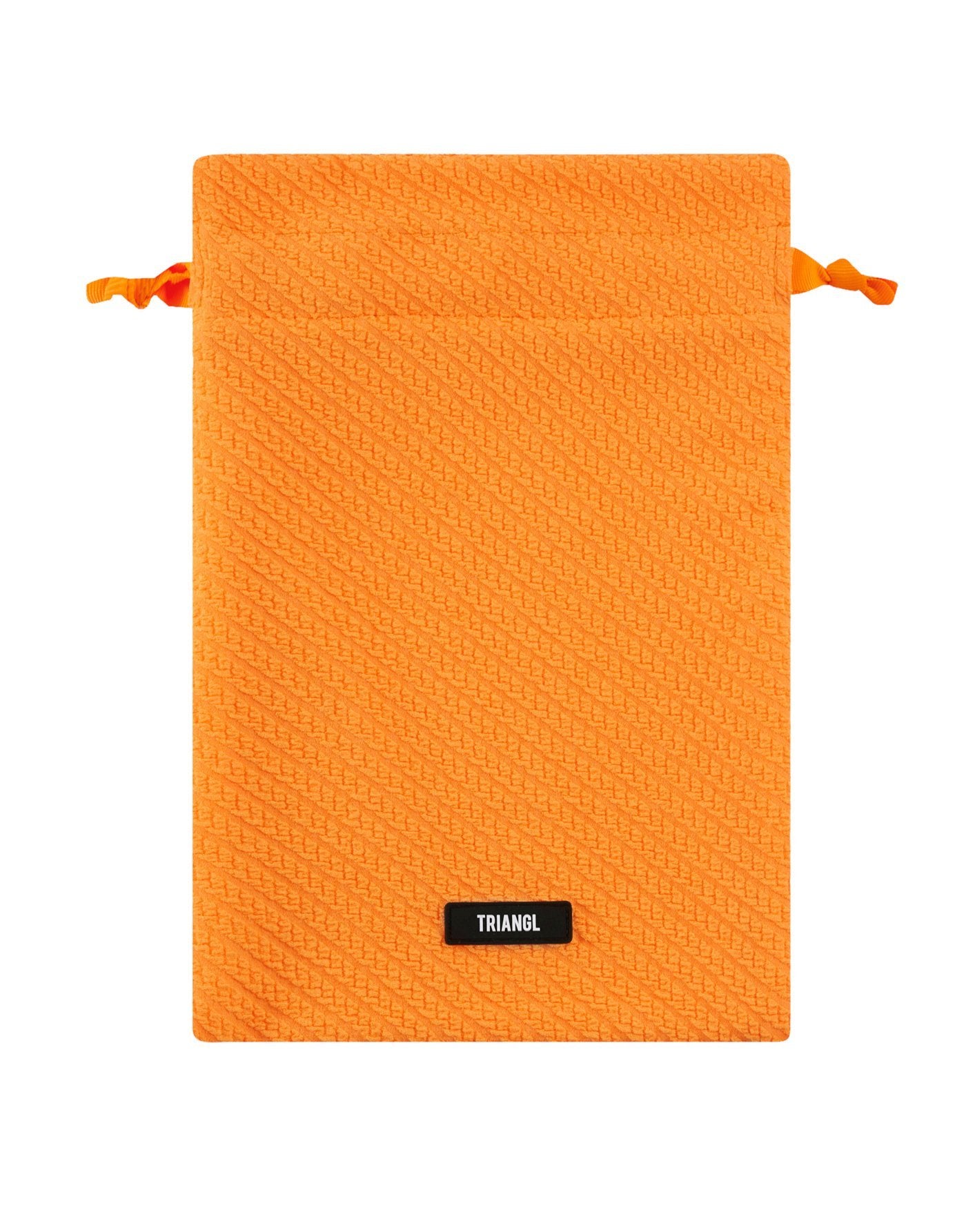 Knot style top with matching high rise bottoms in a bright orange textured pattern fabric. Featuring a padded cup with adjustable shoulder straps and back clasp fastening. The high rise bottom is designed to sit at your natural waist line with a higher cut at the leg. This bikini also comes with a matching drawstring dust bag.