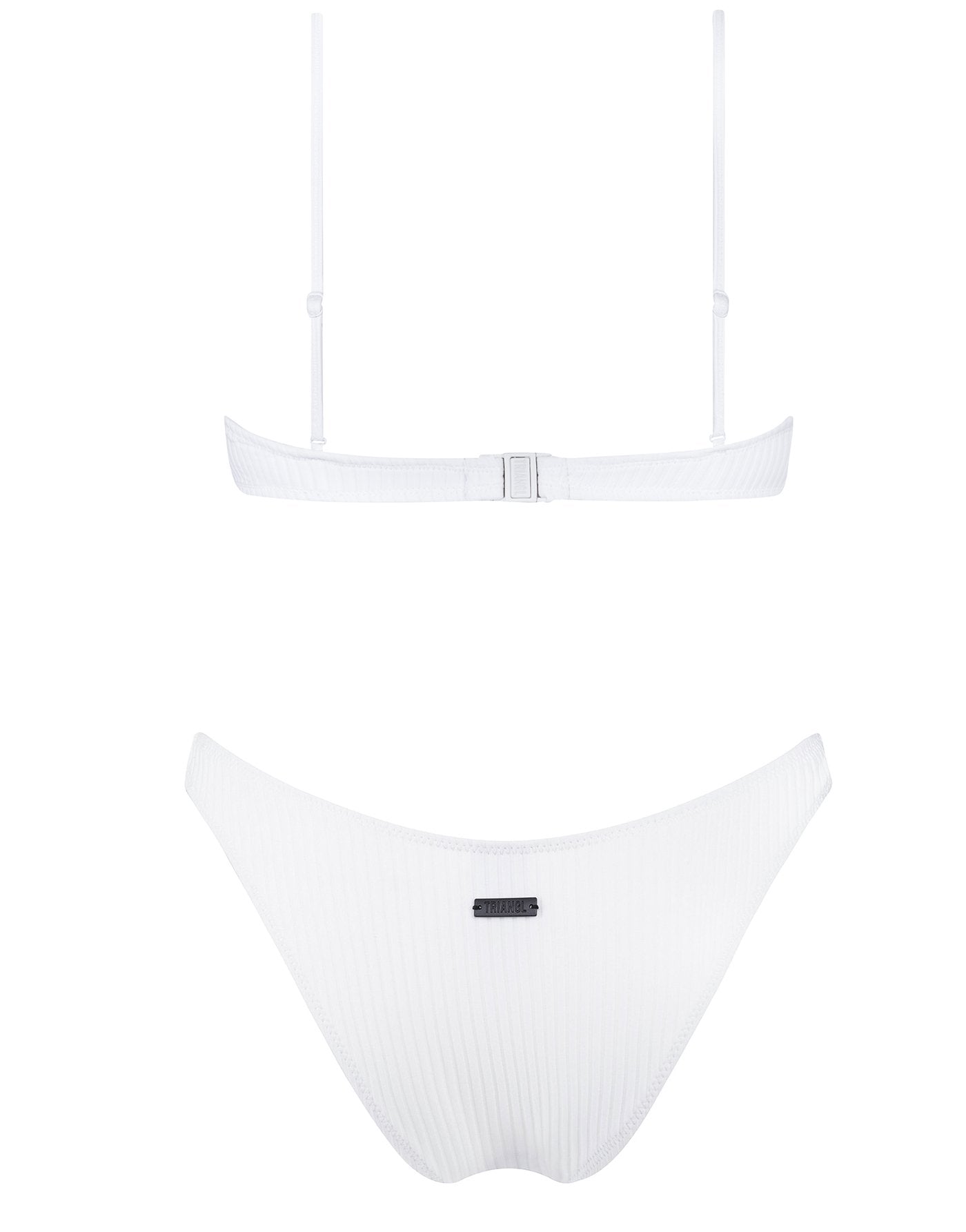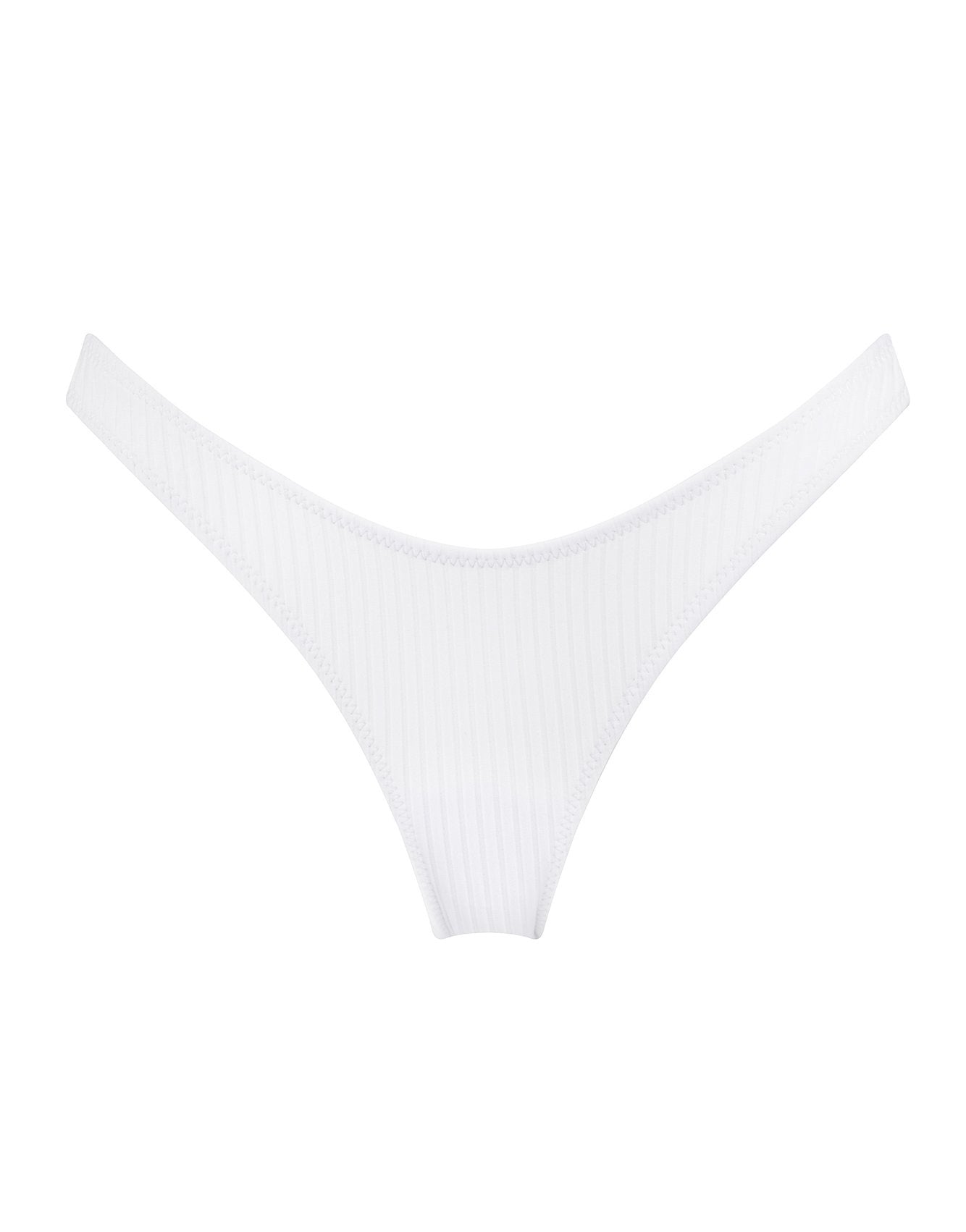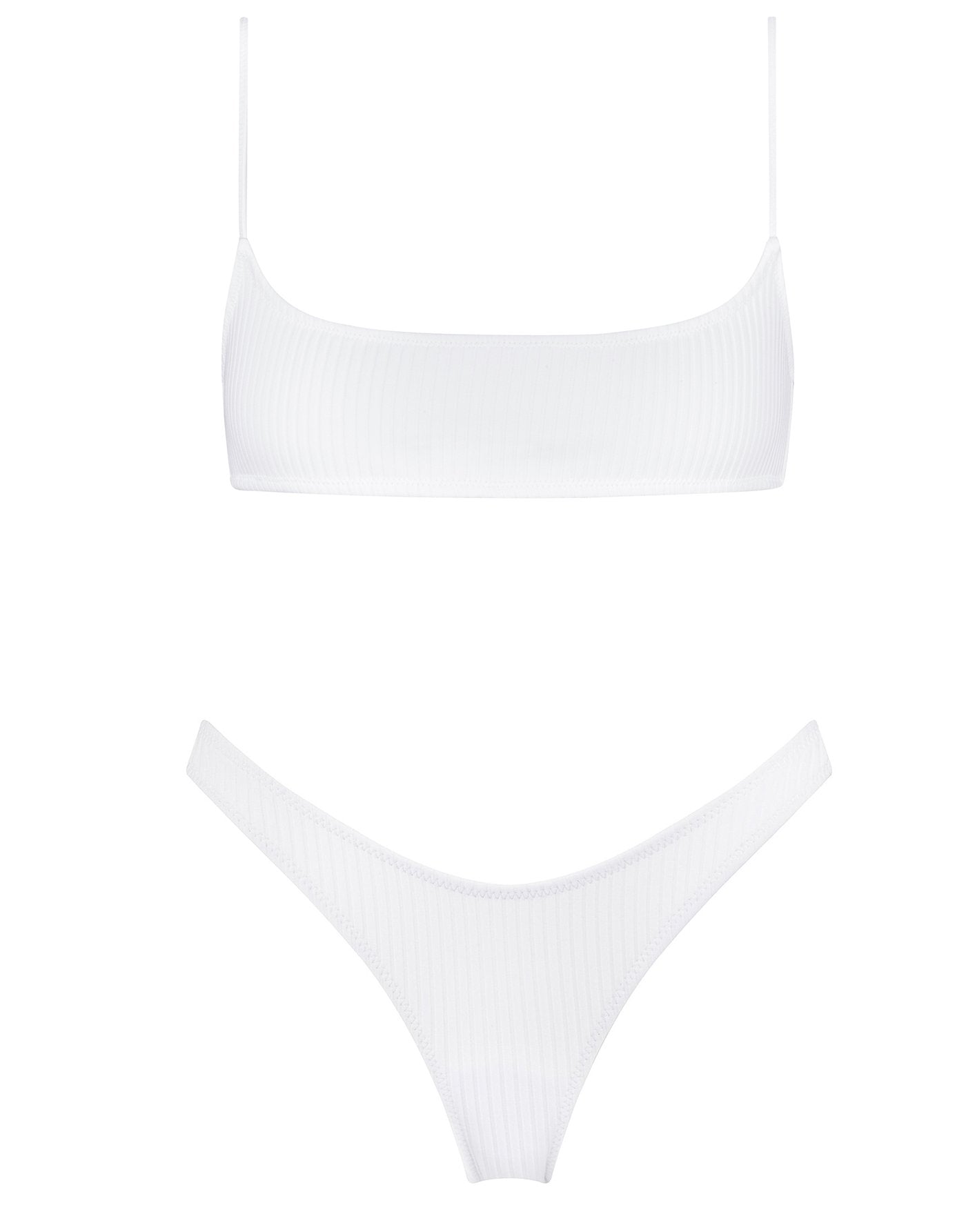 Optic white super stretch nylon spandex ribbed bikini. Featuring a narrower front crop top with adjustable shoulder straps and back clasp fastening. Matched with a high waist bottom in either cheeky or normal fit. This bikini also comes with a matching belt bag.
