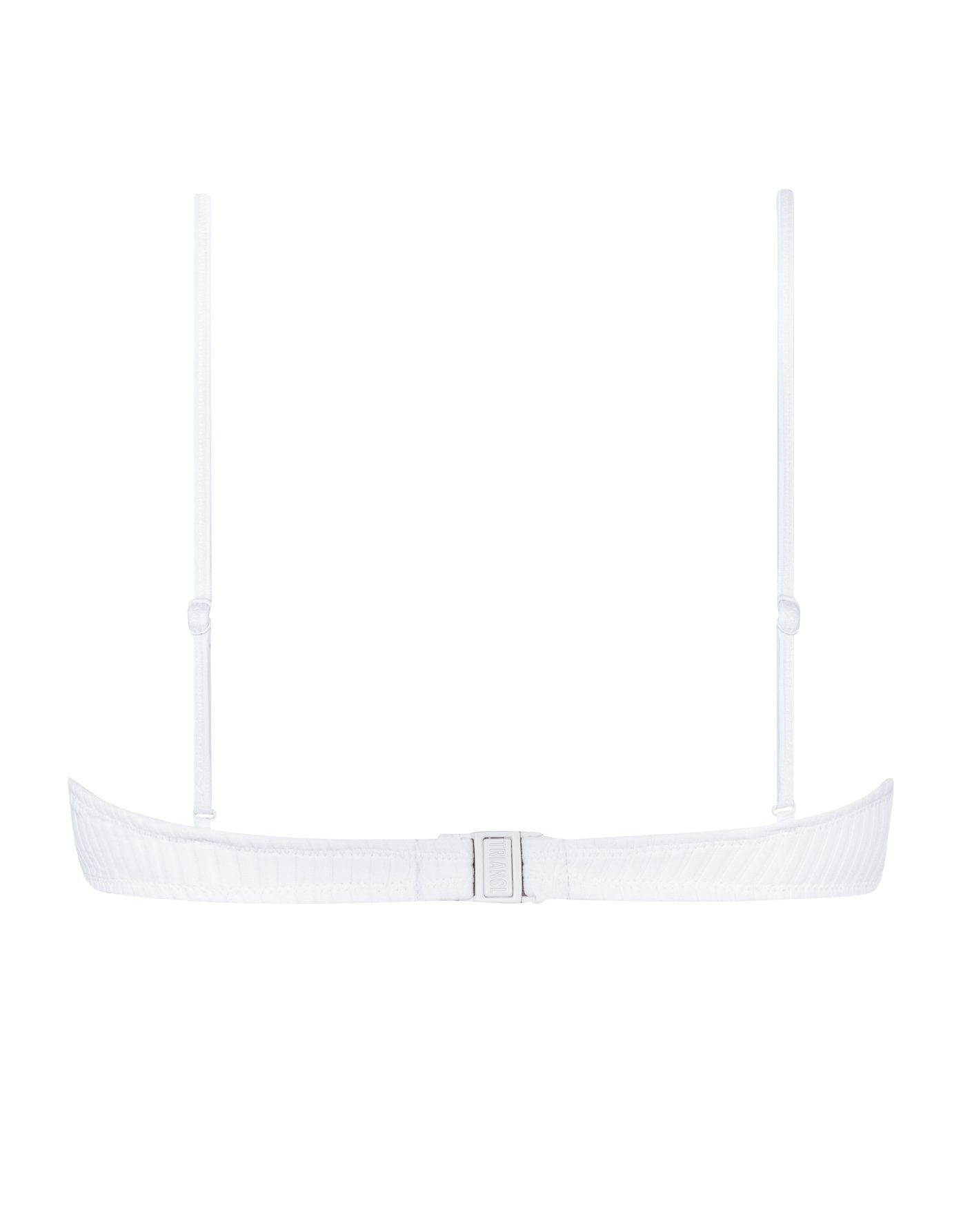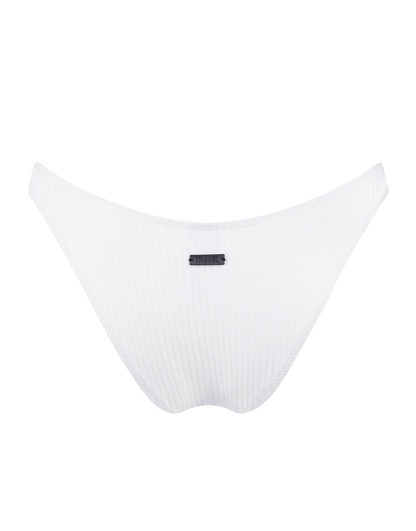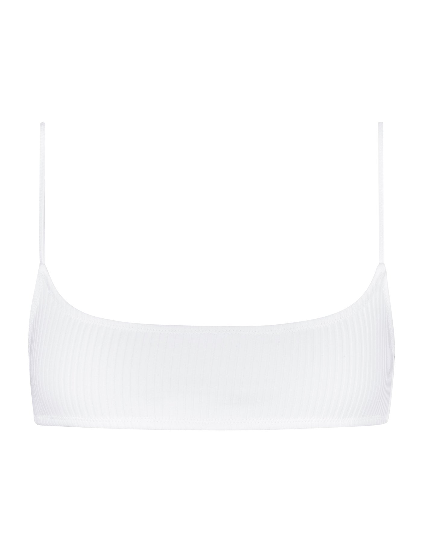Optic white super stretch nylon spandex ribbed bikini. Featuring a narrower front crop top with adjustable shoulder straps and back clasp fastening. Matched with a high waist bottom in either cheeky or normal fit. This bikini also comes with a matching belt bag.