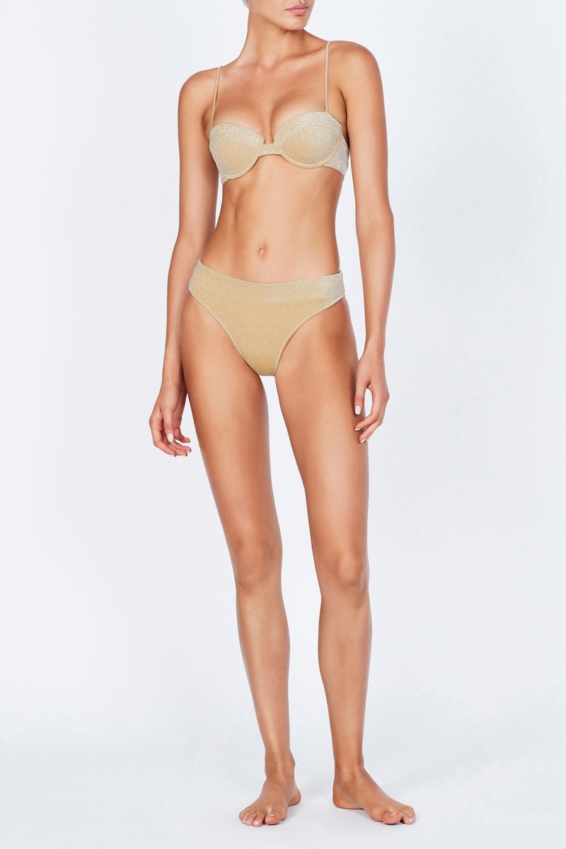 A bra style top with matching high waist bottoms in lurex. Featuring a padded cup with adjustable shoulder straps and back clasp fastening. The high waist bottom features a wide band that sits close to the waist. This bikini also comes with a matching drawstring dust bag.