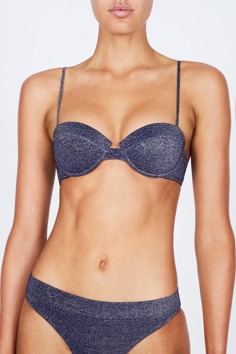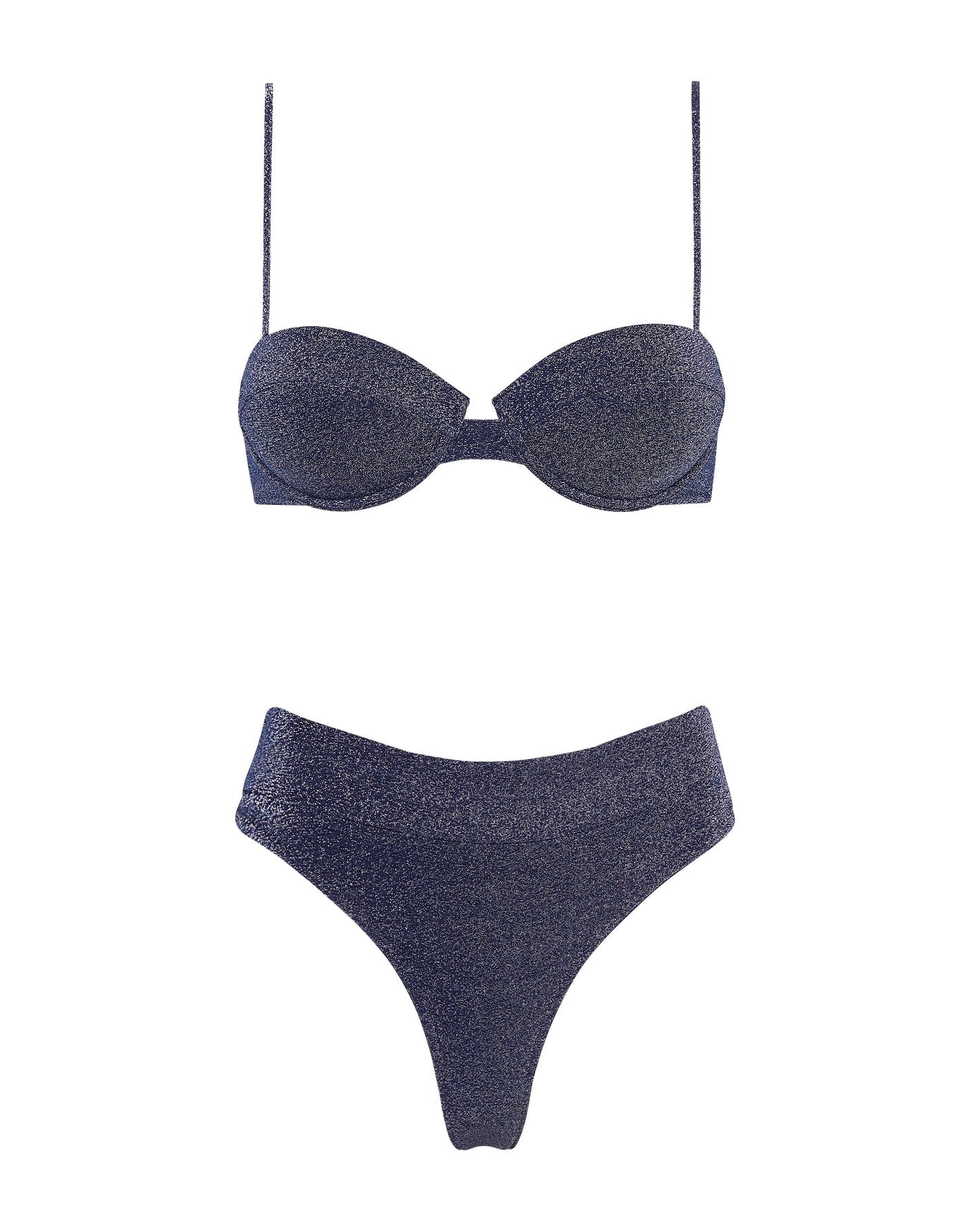 A bra style top with matching high waist bottoms in lurex. Featuring a padded cup with adjustable shoulder straps and back clasp fastening. The high waist bottom features a wide band that sits close to the waist. This bikini also comes with a matching drawstring dust bag.