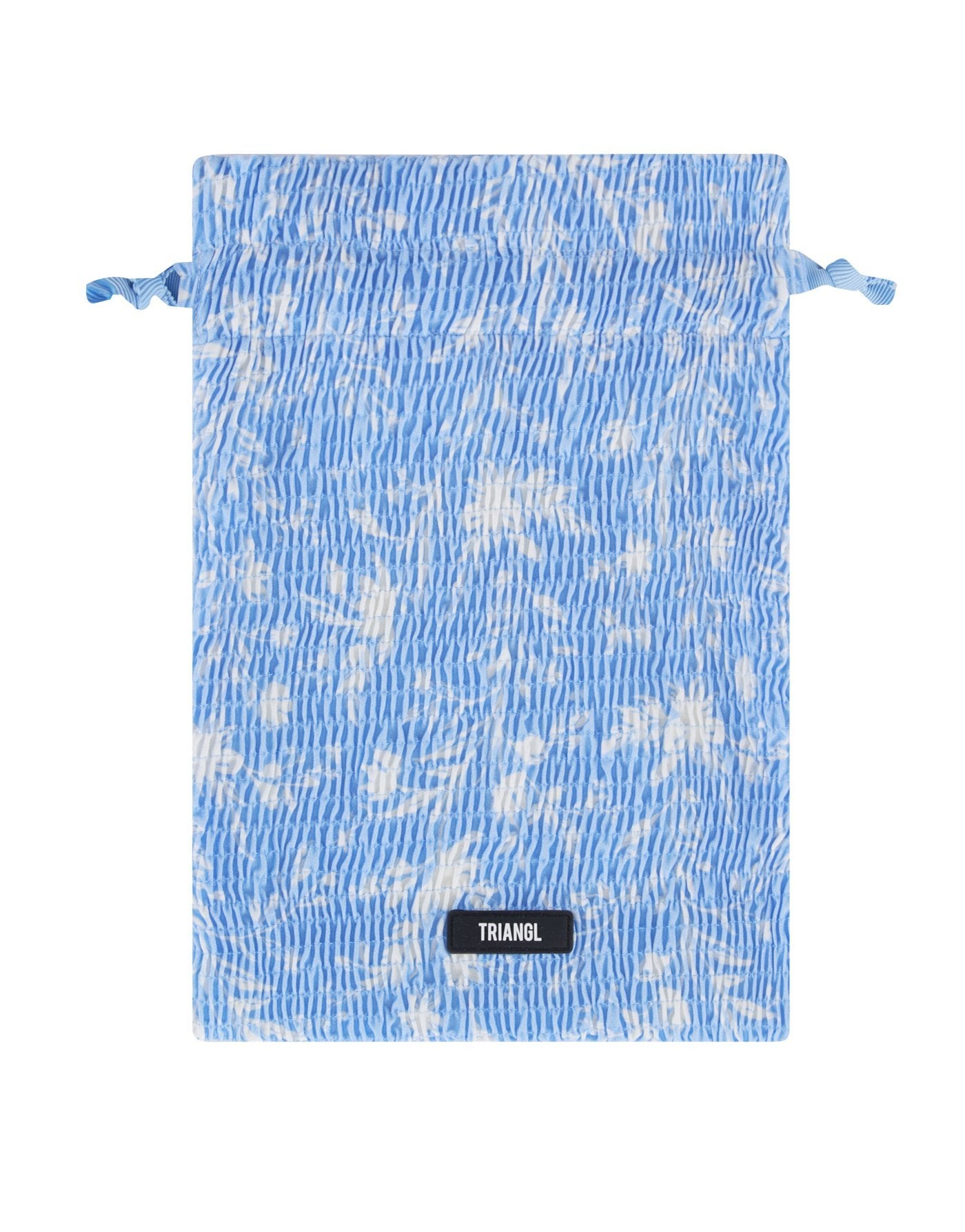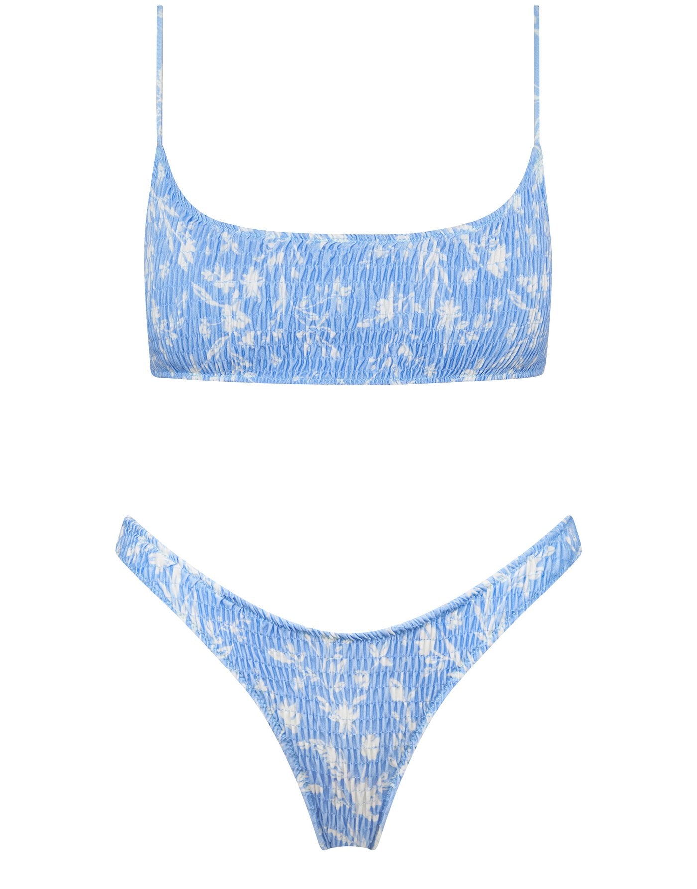 A ruched scoop crop bikini top in blue floral with matching high waist bottoms. Strappy crop top with adjustable shoulder straps and back clasp fastening. Choose from either a cheeky bottom or normal bottom for a little more coverage. This bikini also comes with a matching ruched drawstring dust bag.