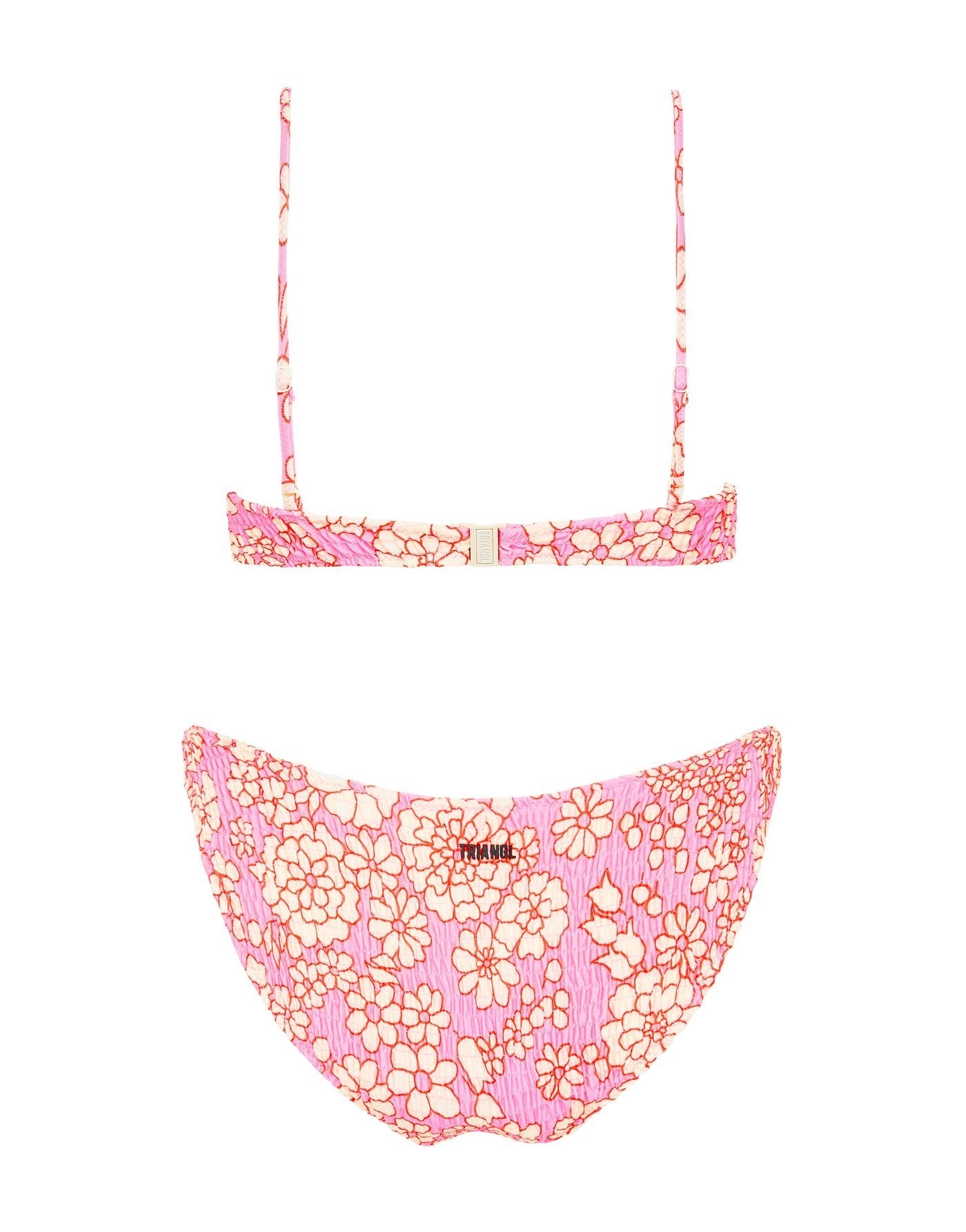A ruched scoop crop bikini top in pink and white floral with matching high waist bottoms. Strappy crop top with adjustable shoulder straps and back clasp fastening. Choose from either a cheeky bottom or normal bottom for a little more coverage. This bikini also comes with a matching ruched drawstring dust bag.