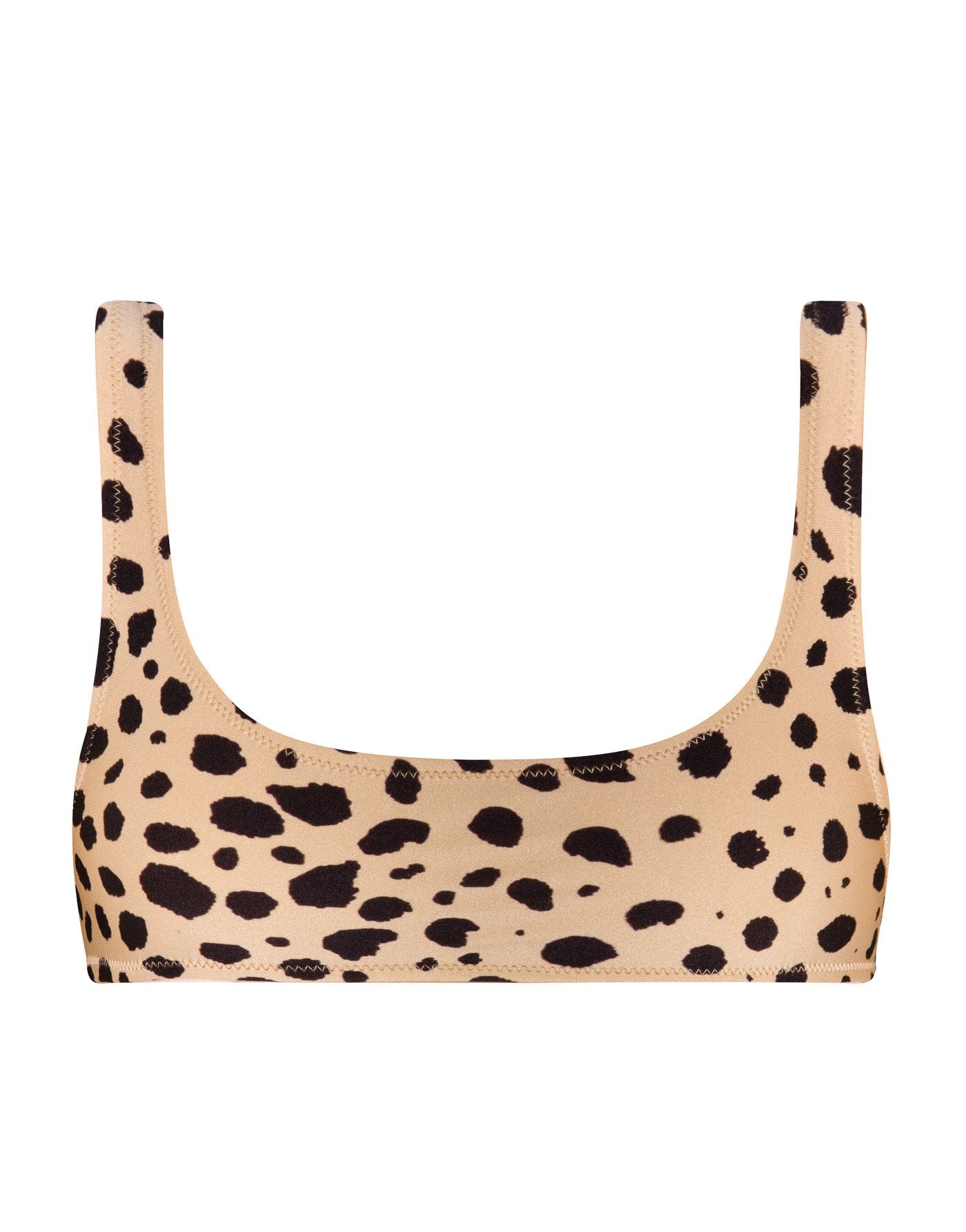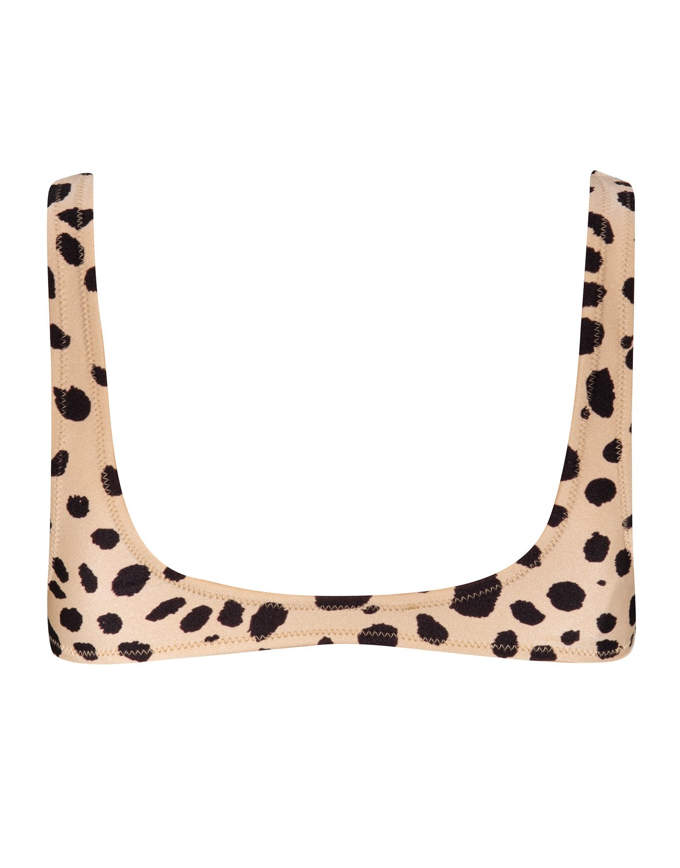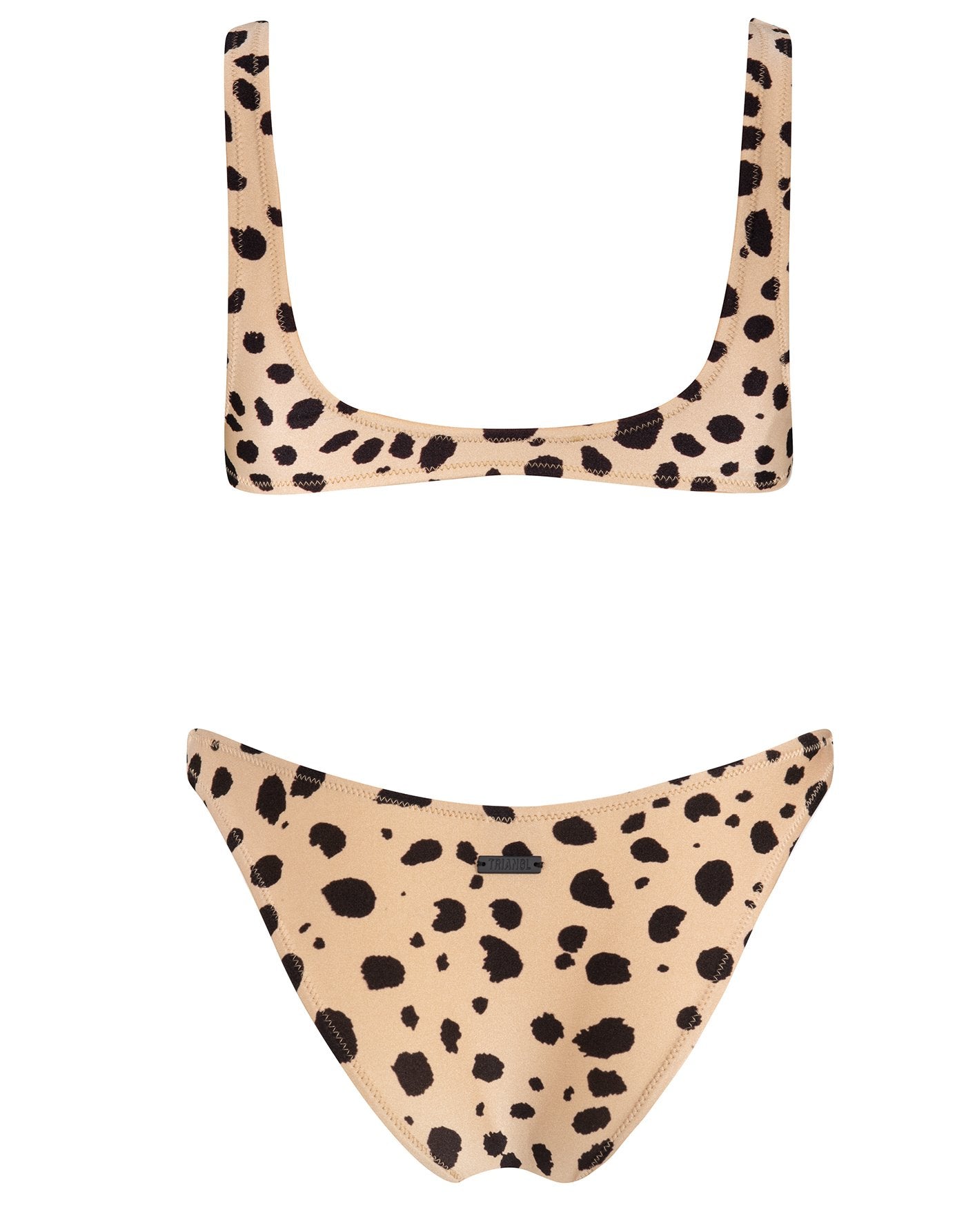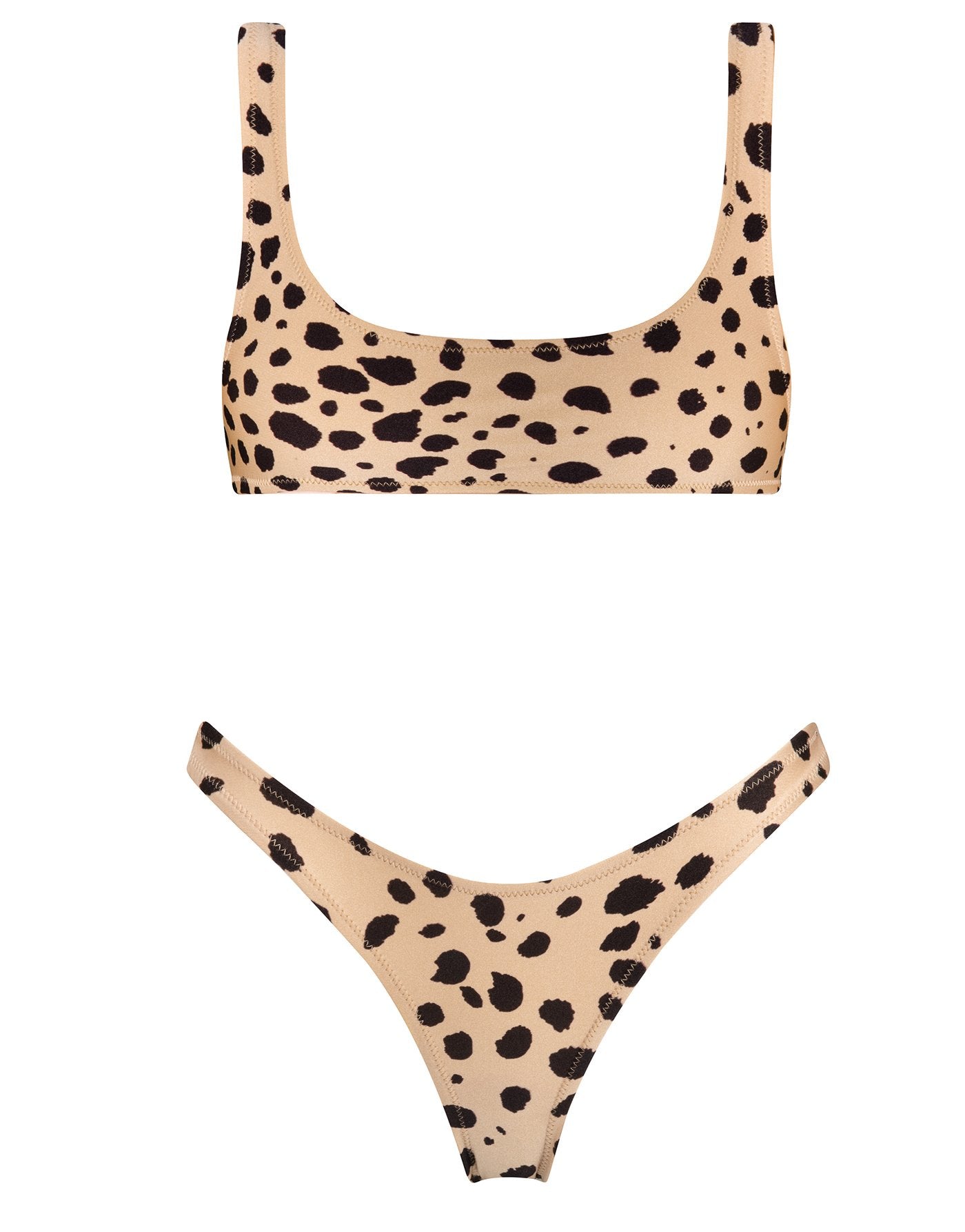 Super stretch nylon spandex bikini in cheetah print. Deep scoop crop top with either high waist cheeky bottoms or high waist normal bottoms. This bikini also comes with a matching cheetah print belt bag.
