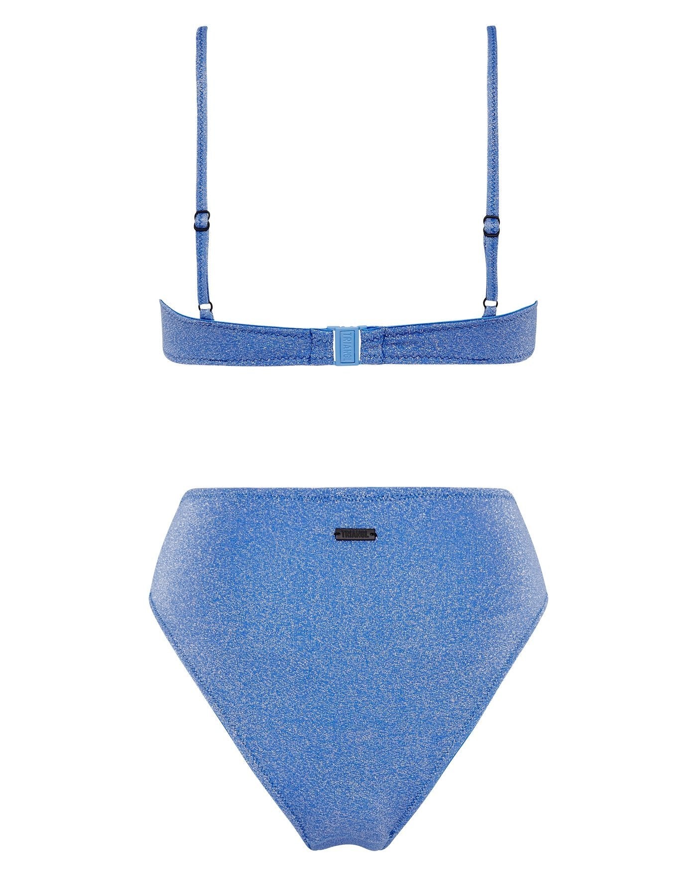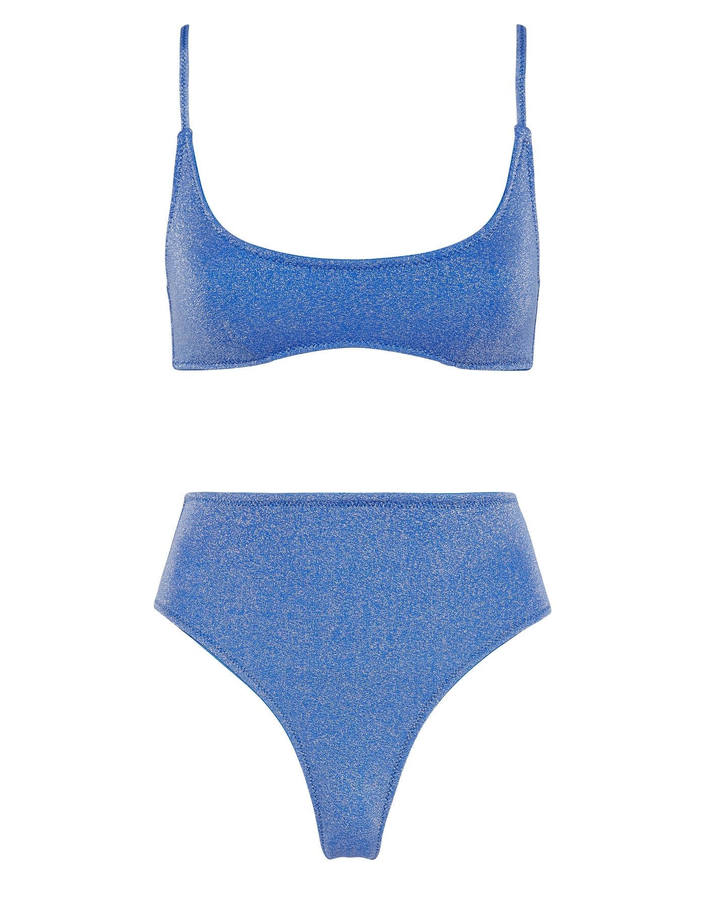 A textured pattern scoop crop bikini top in lurex with matching high waist bottoms. Strappy crop top with adjustable shoulder straps and back clasp fastening.This bikini also comes with a matching drawstring dust bag.