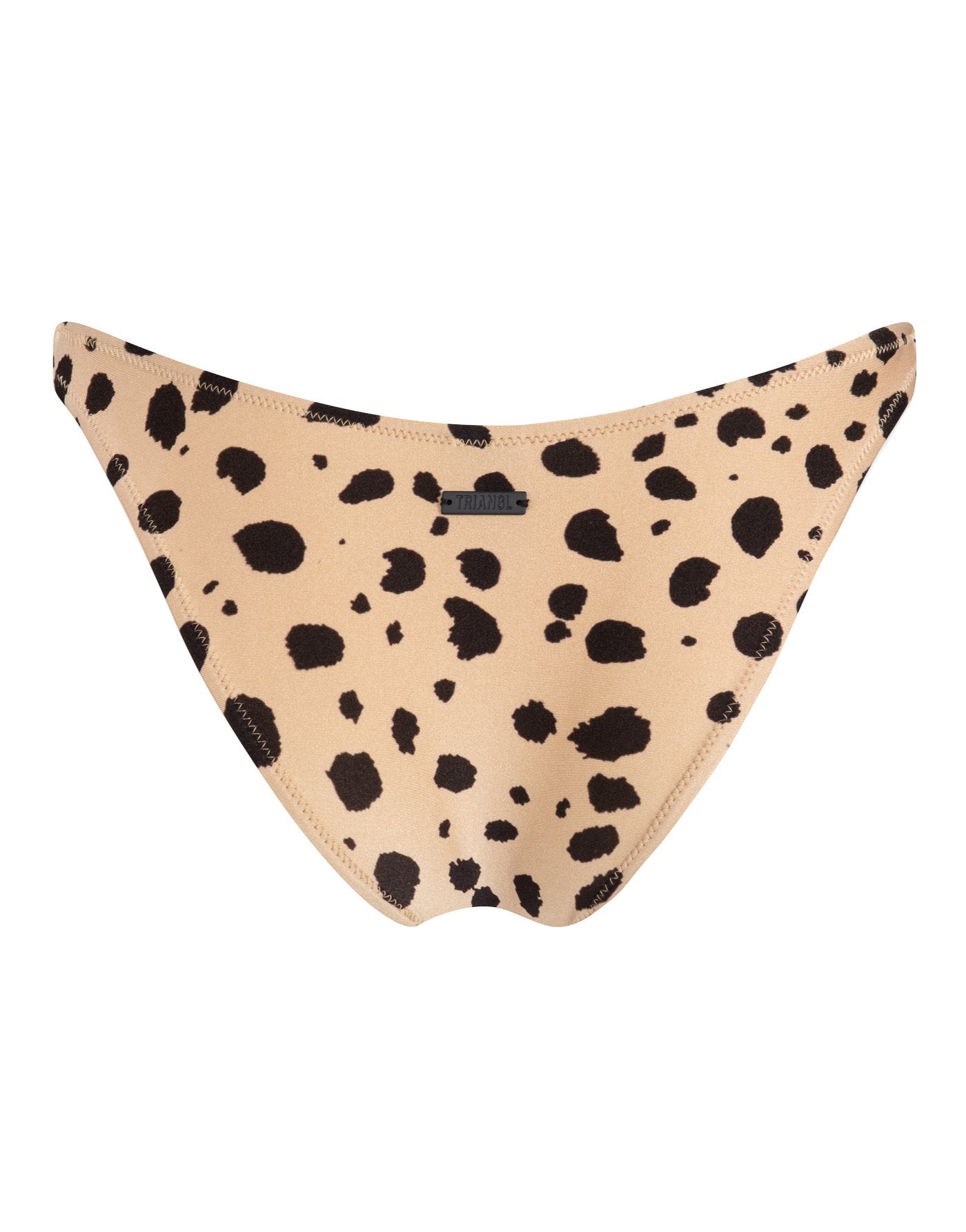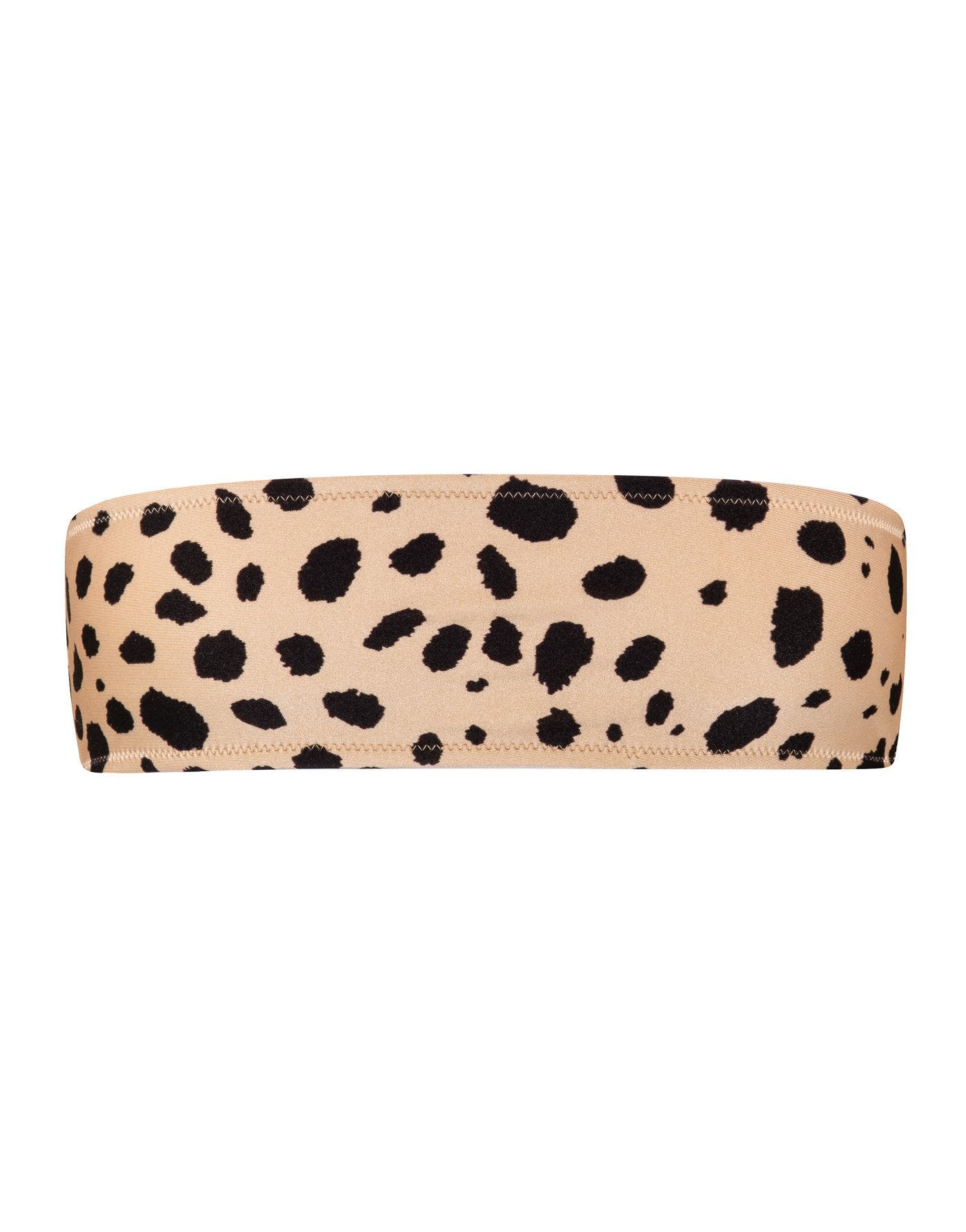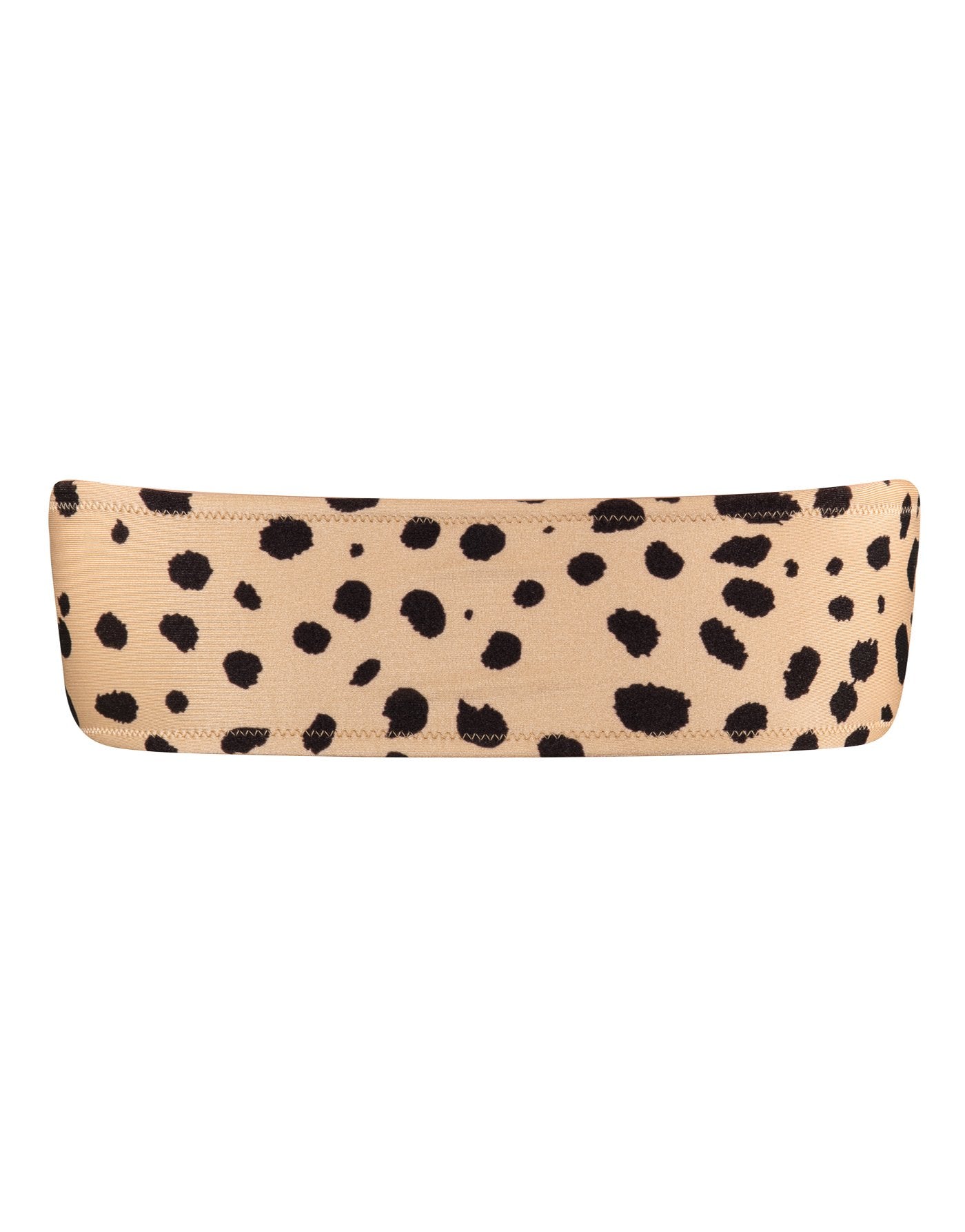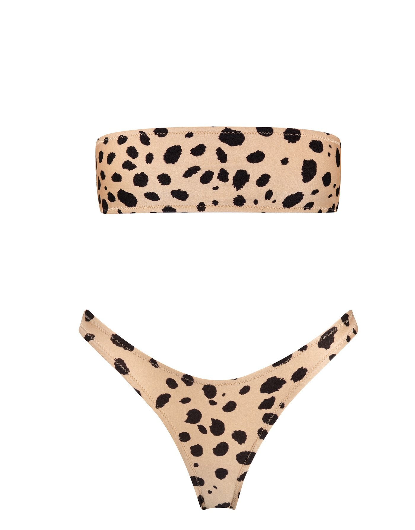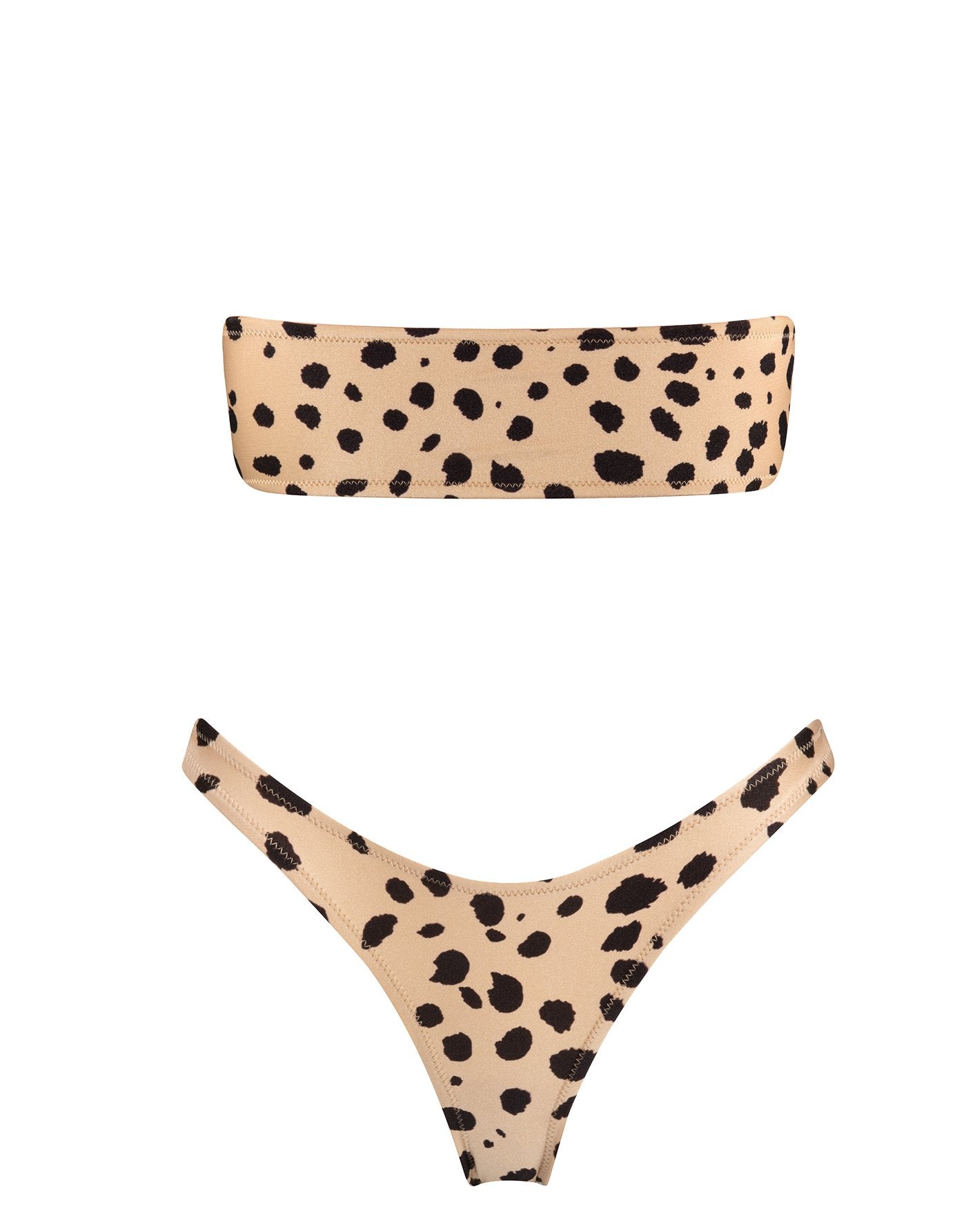Neoprene strapless bikini in cheetah print. With a flattering neoprene top and matching high waist bottoms. Choose from either a cheeky bottom or normal bottom for a little more coverage. This bikini also comes with a black neoprene backpack.