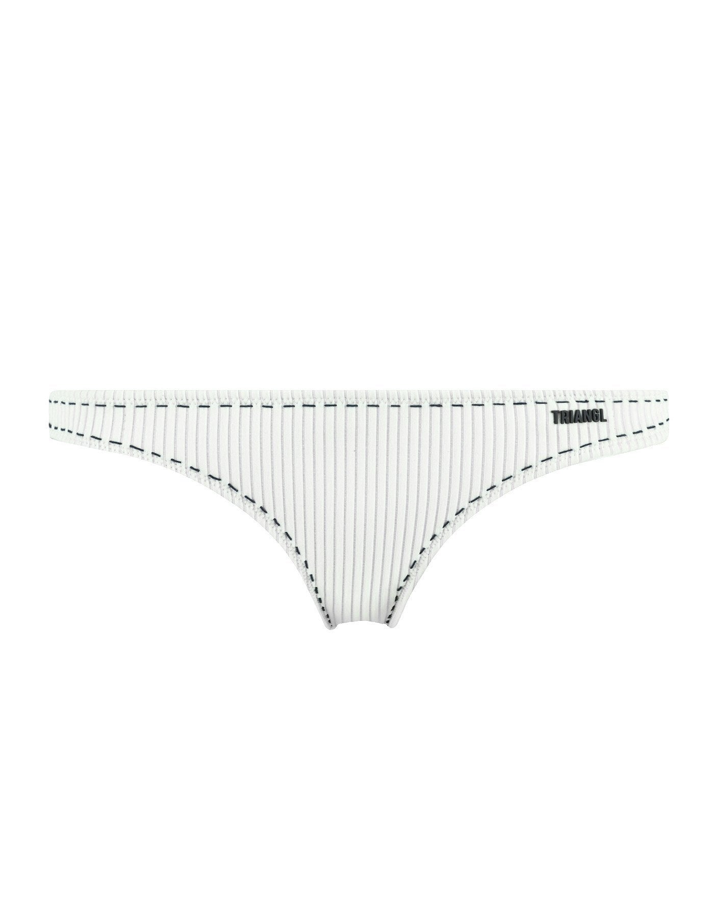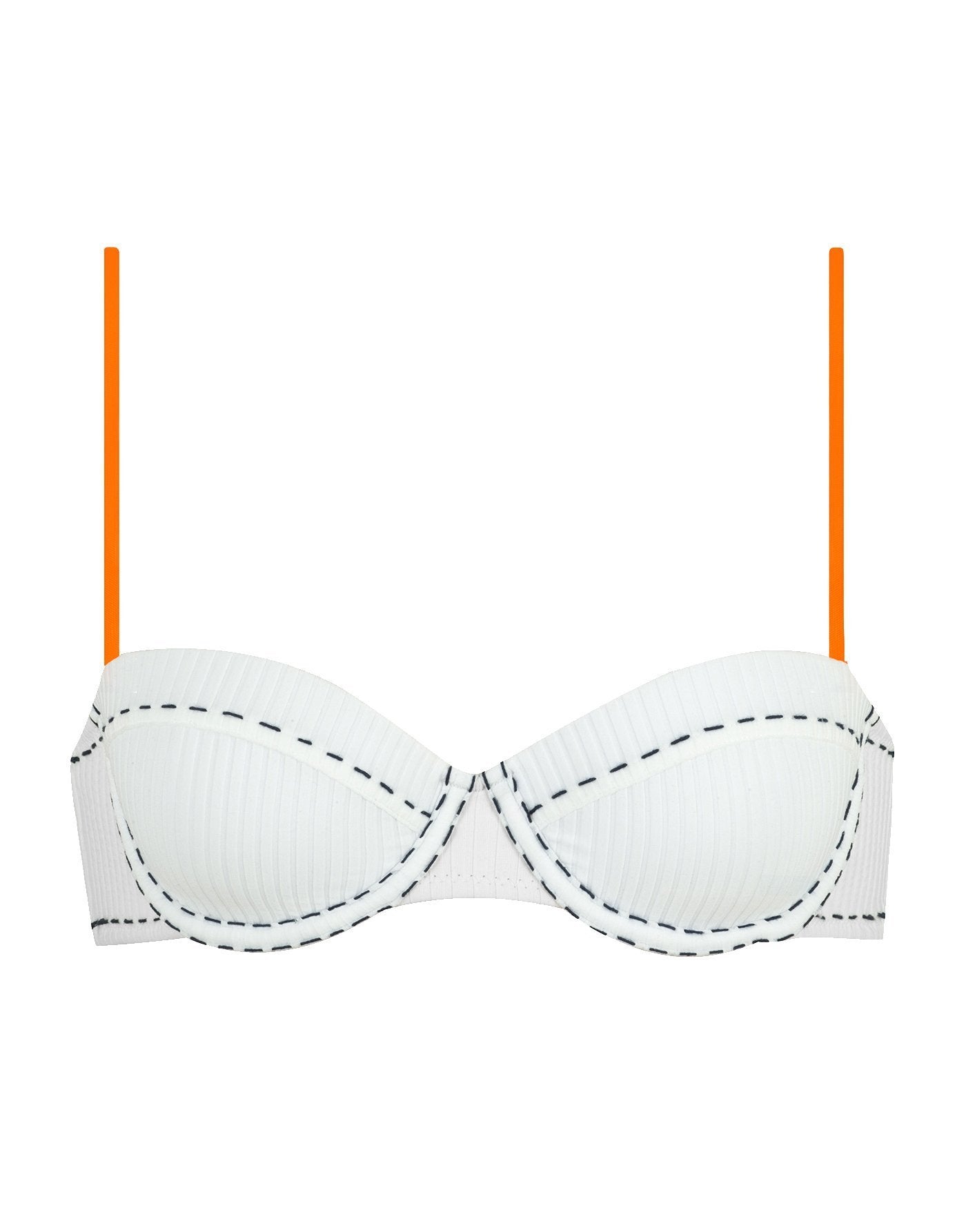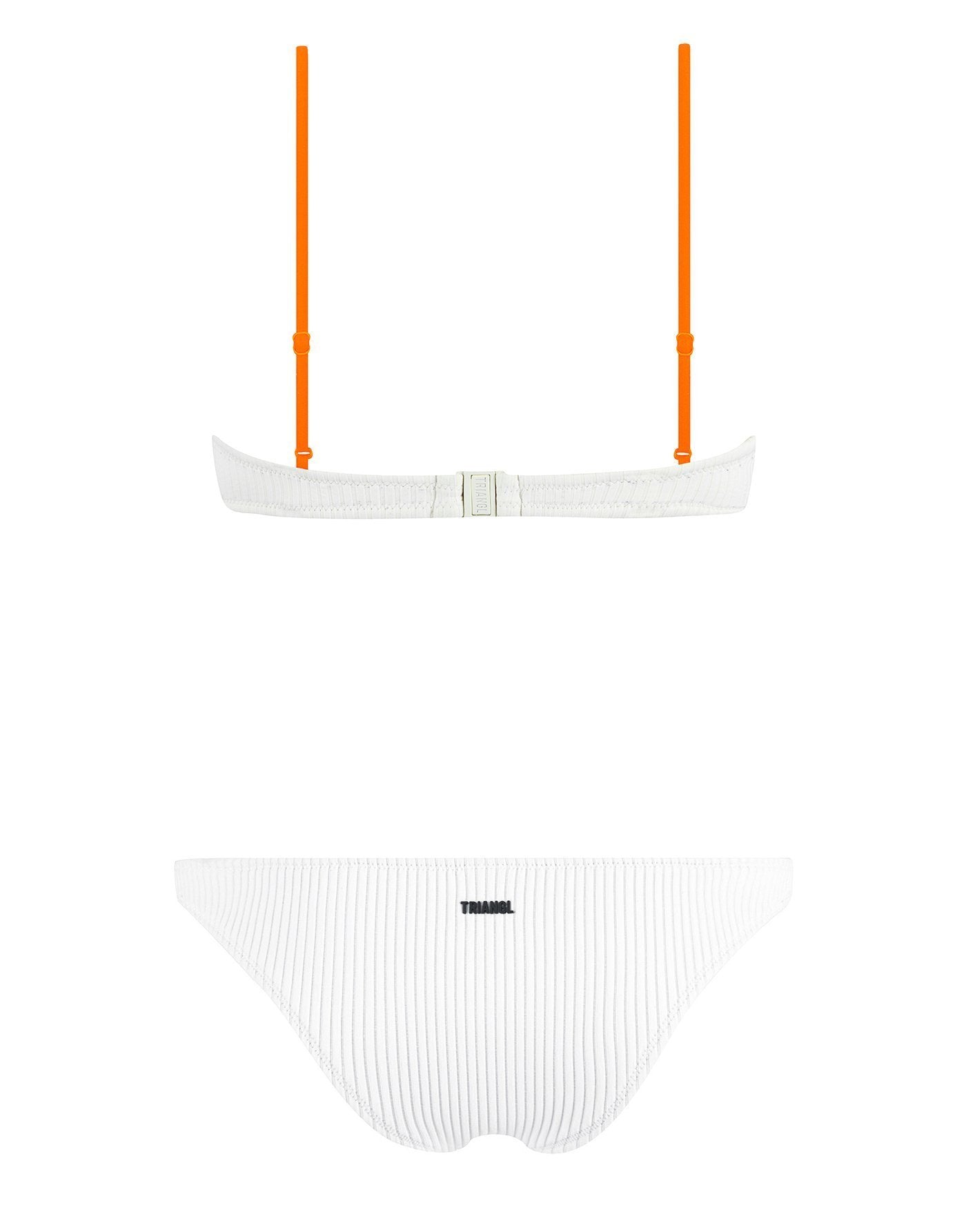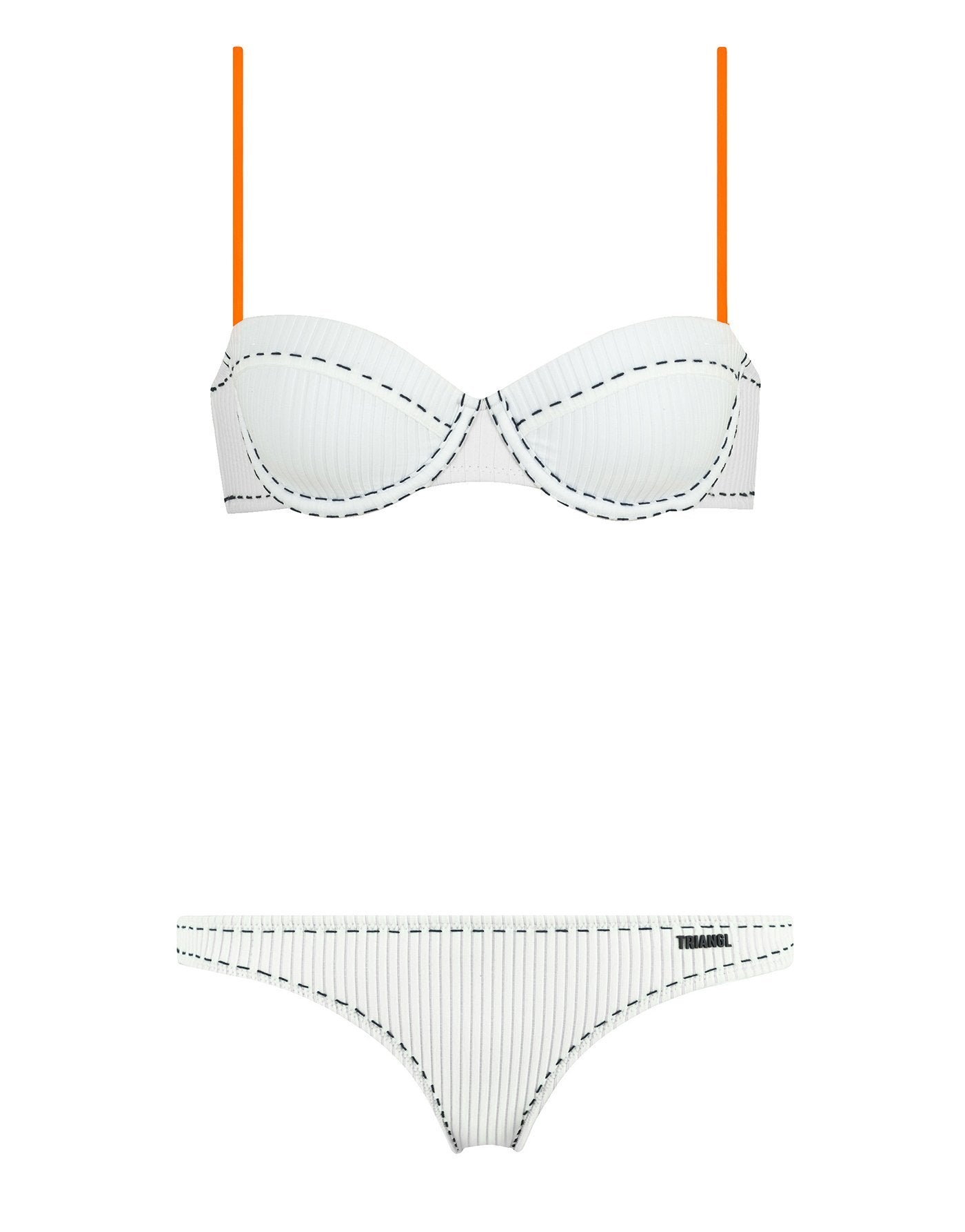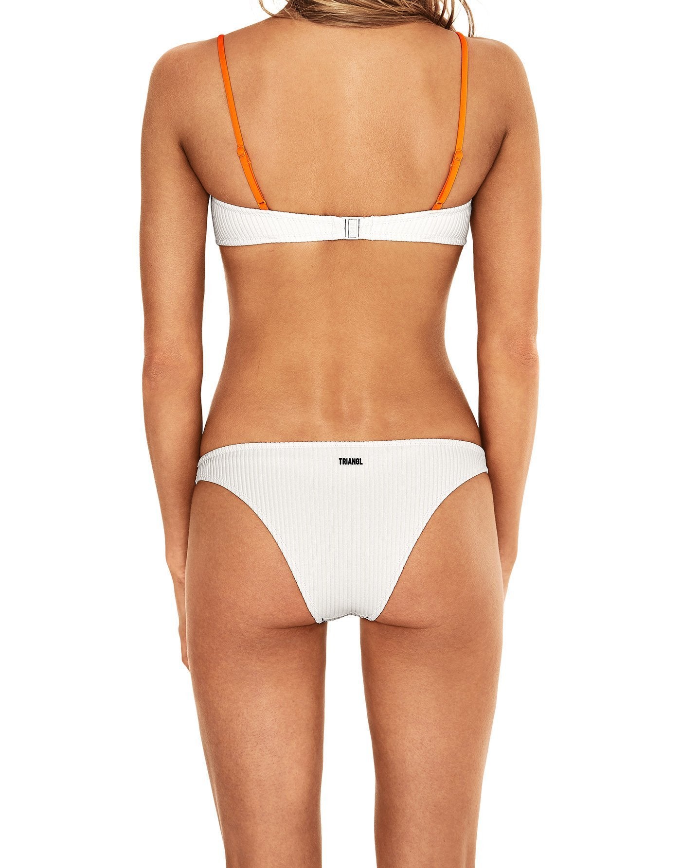 Off white neoprene rib balconnet bikini with contrast stitching. Adjustable shoulder straps and back clasp fastening. Bottoms available in classic or cheeky bum. This bikini also comes with an off white neoprene drawstring backpack. Model is 177m / 5’10” and is wearing XS top / XS bottom.