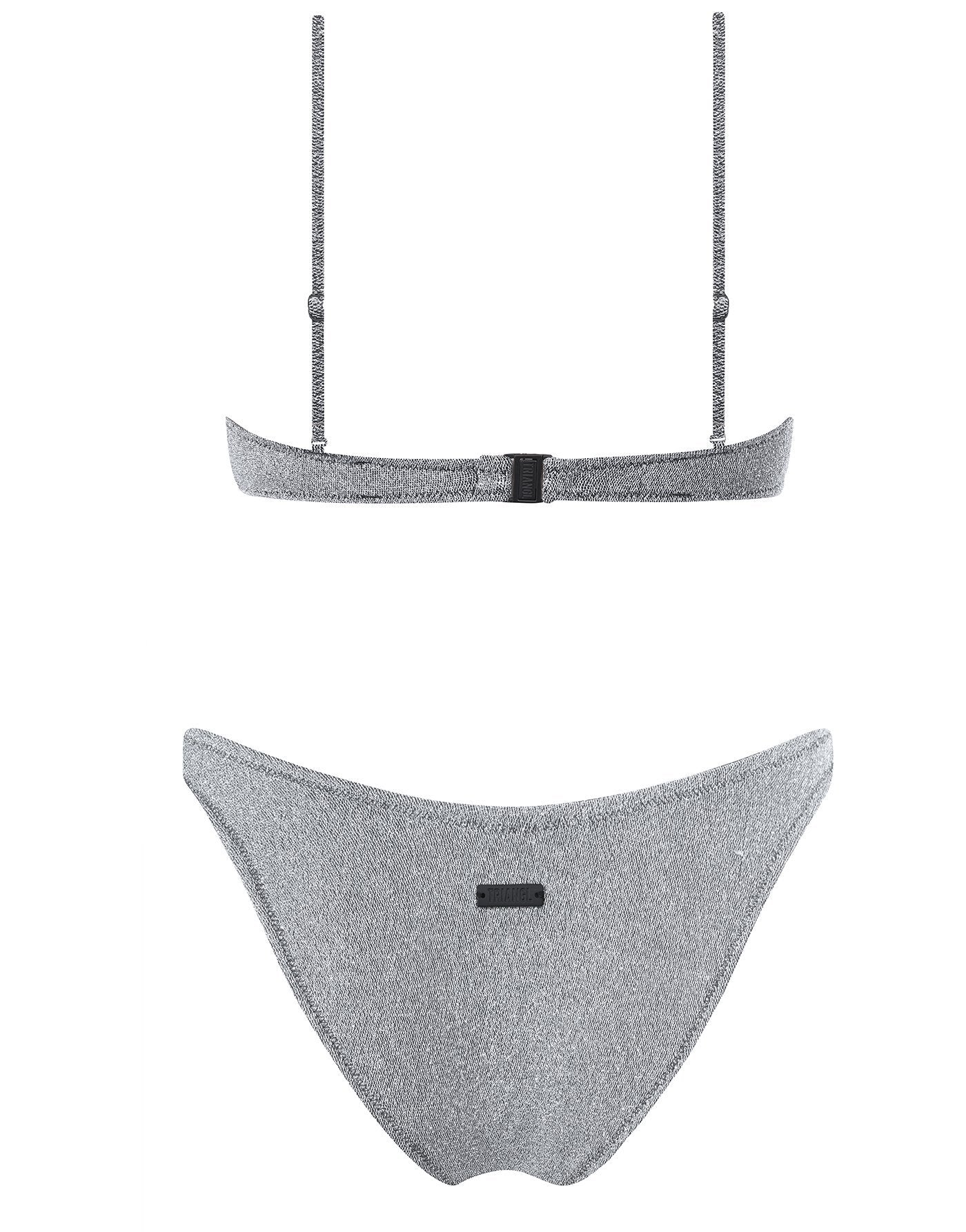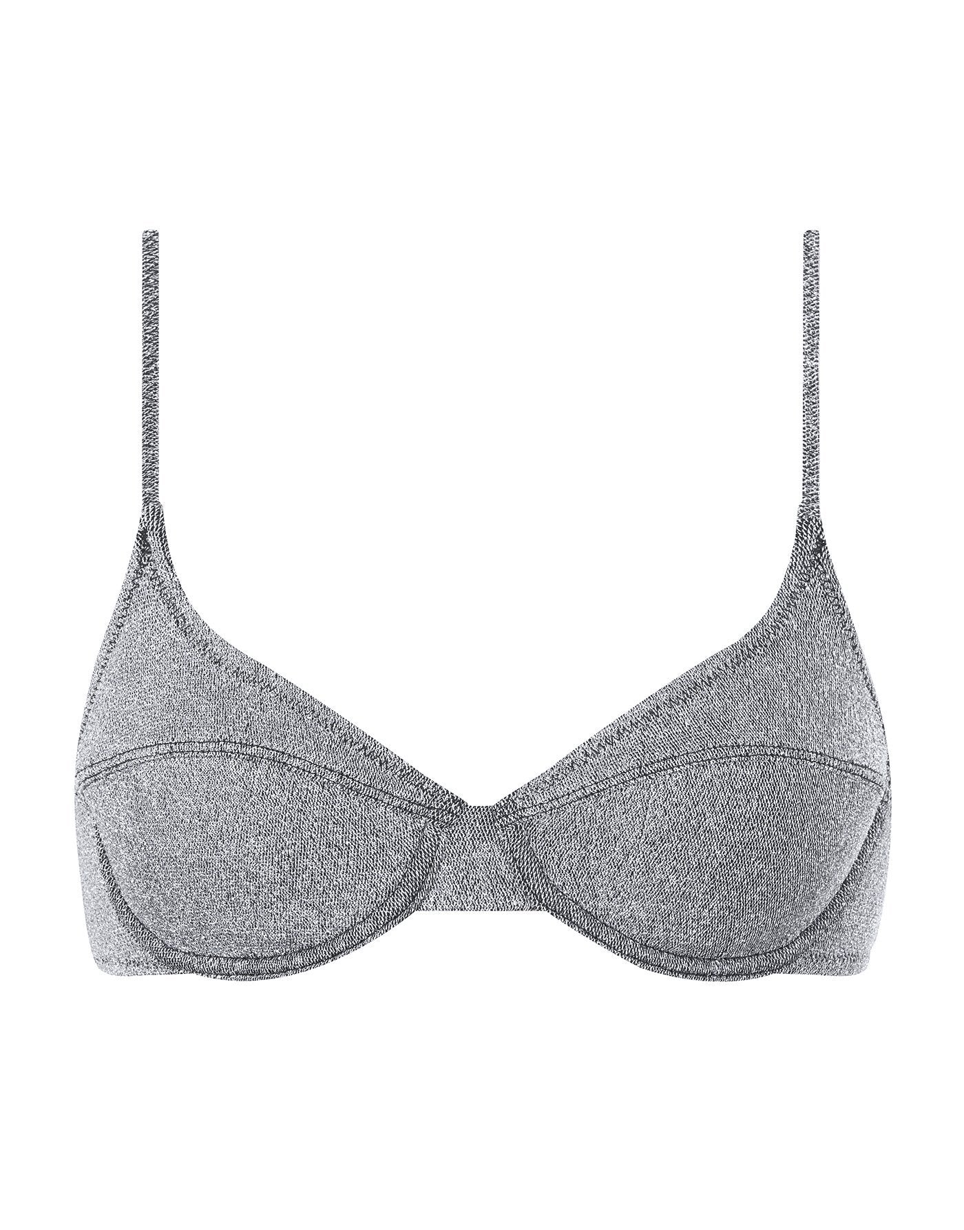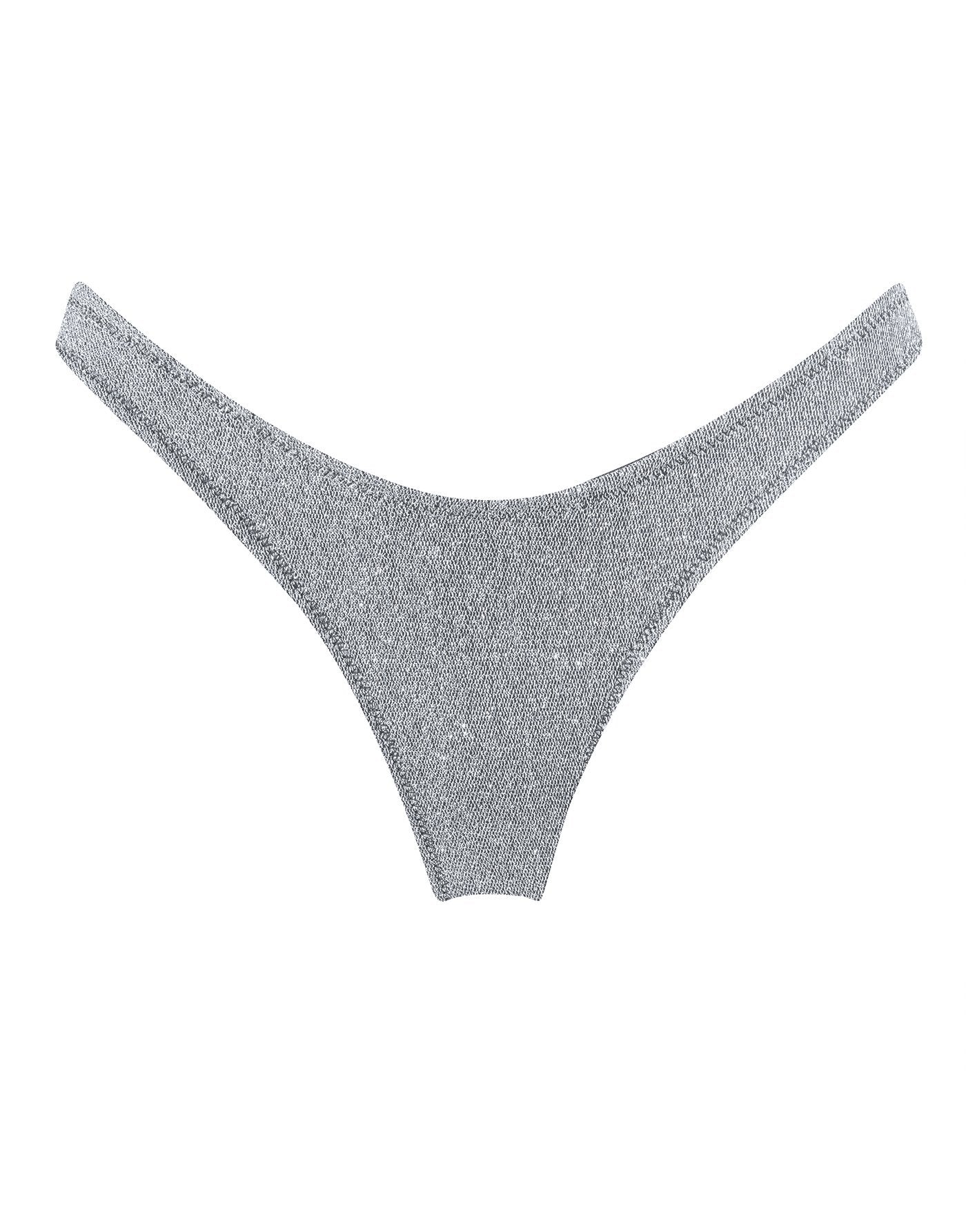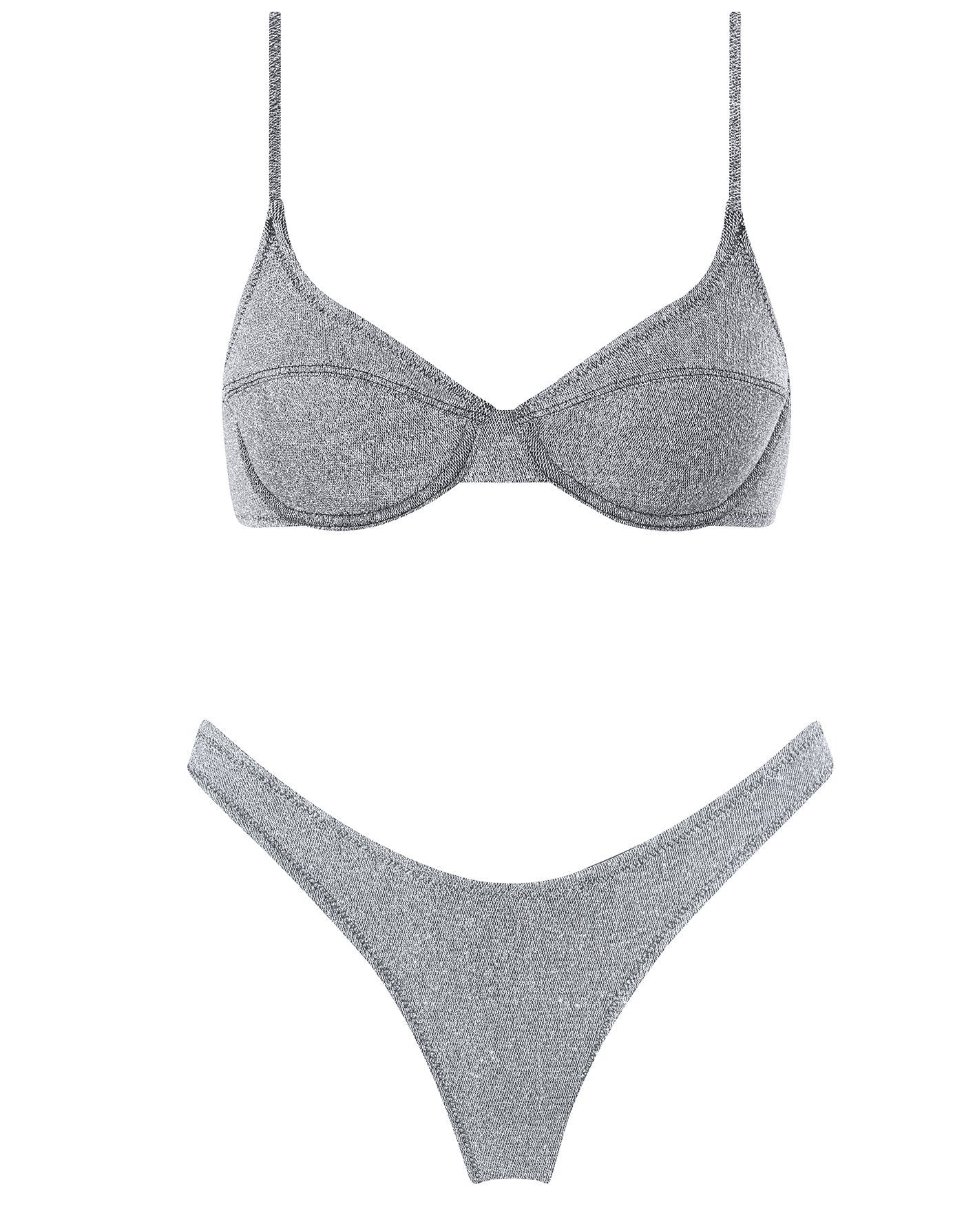 A super flattering and supportive underwire bra style top in silver lurex. Matched with high waist bottoms in either cheeky or normal fit to suit you. This bikini also comes with a neoprene zip pouch.