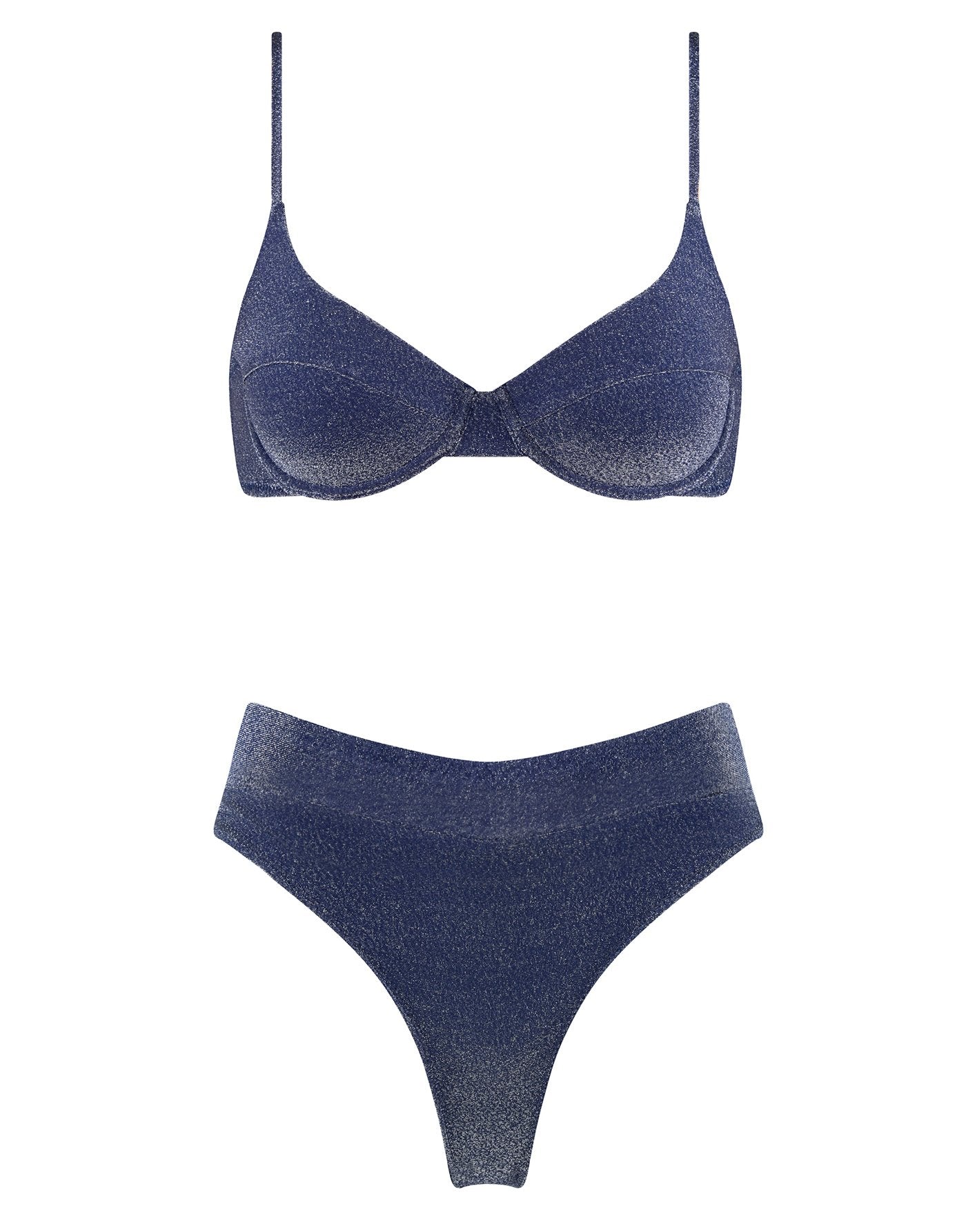 A bra style top with matching high waist bottoms in midnight blue lurex. Featuring a padded cup with adjustable shoulder straps and back clasp fastening. The high waist bottom features a wide band that sits close to the waist. This bikini also comes with a matching drawstring dust bag.