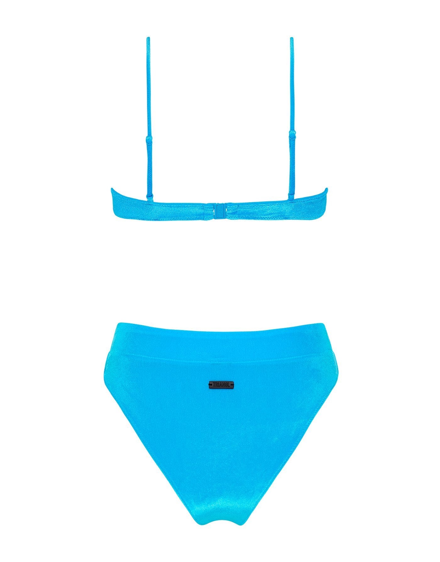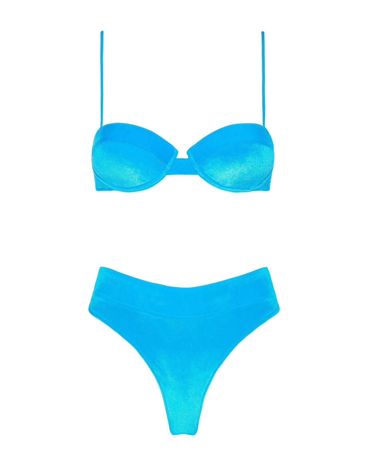 A bra style top with matching high rise bottoms in velvet. Featuring a padded cup with adjustable shoulder straps and back clasp fastening. The high waist bottom features a wide band that sits close to the waist. This bikini also comes with a matching ruched drawstring dust bag.