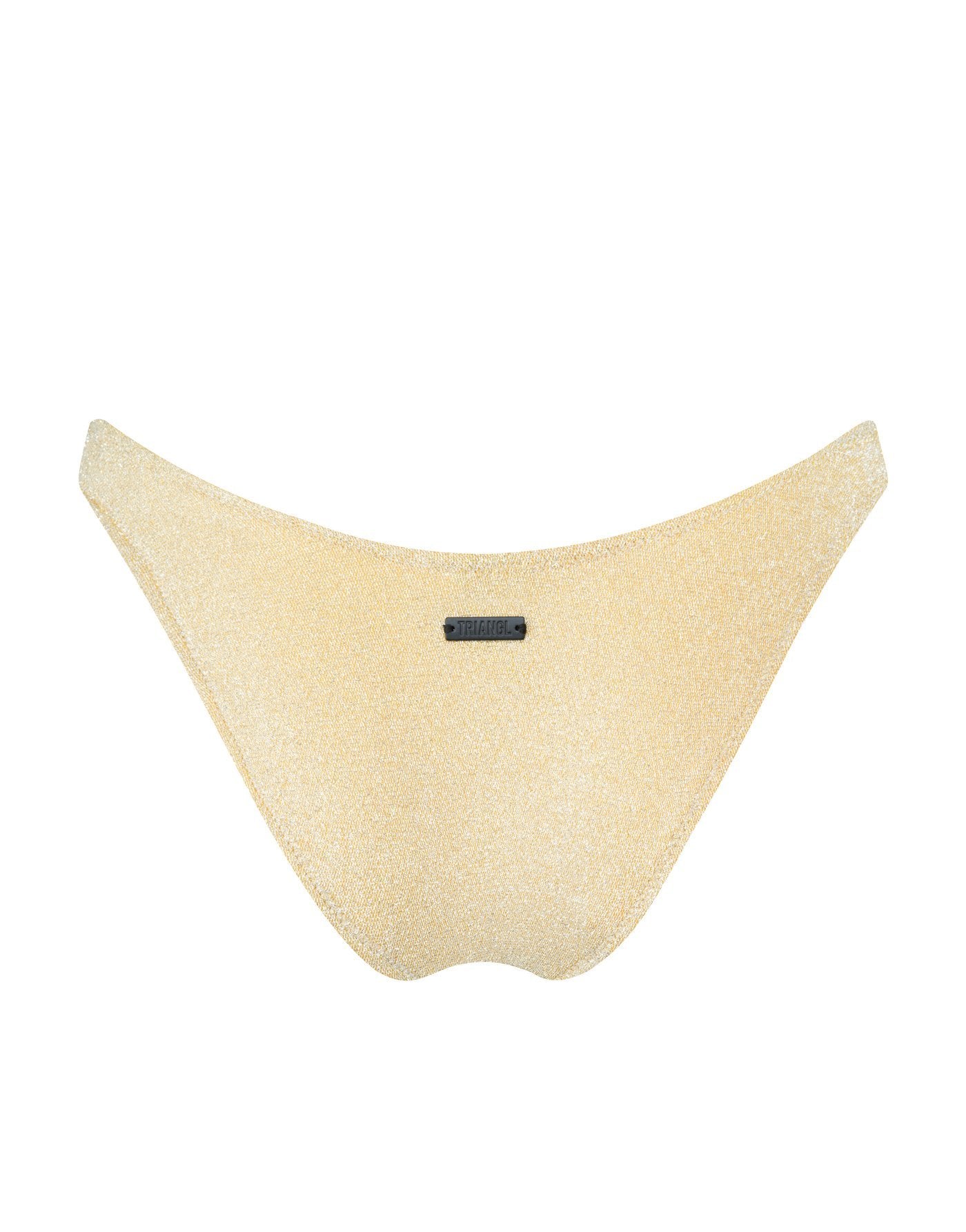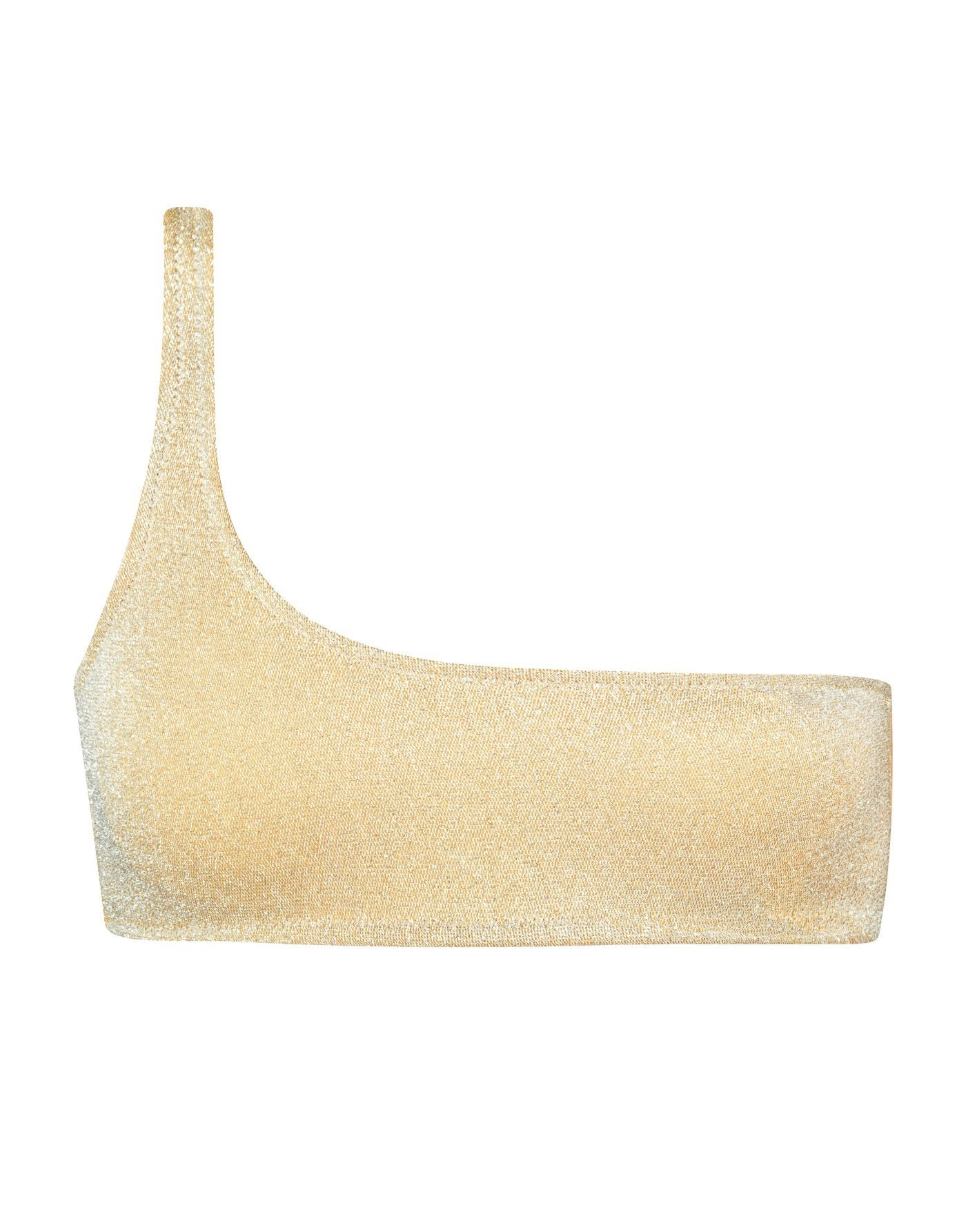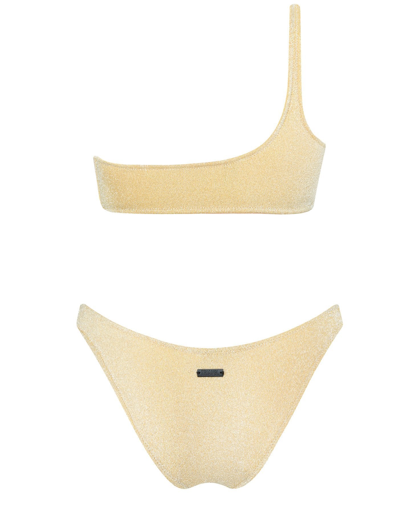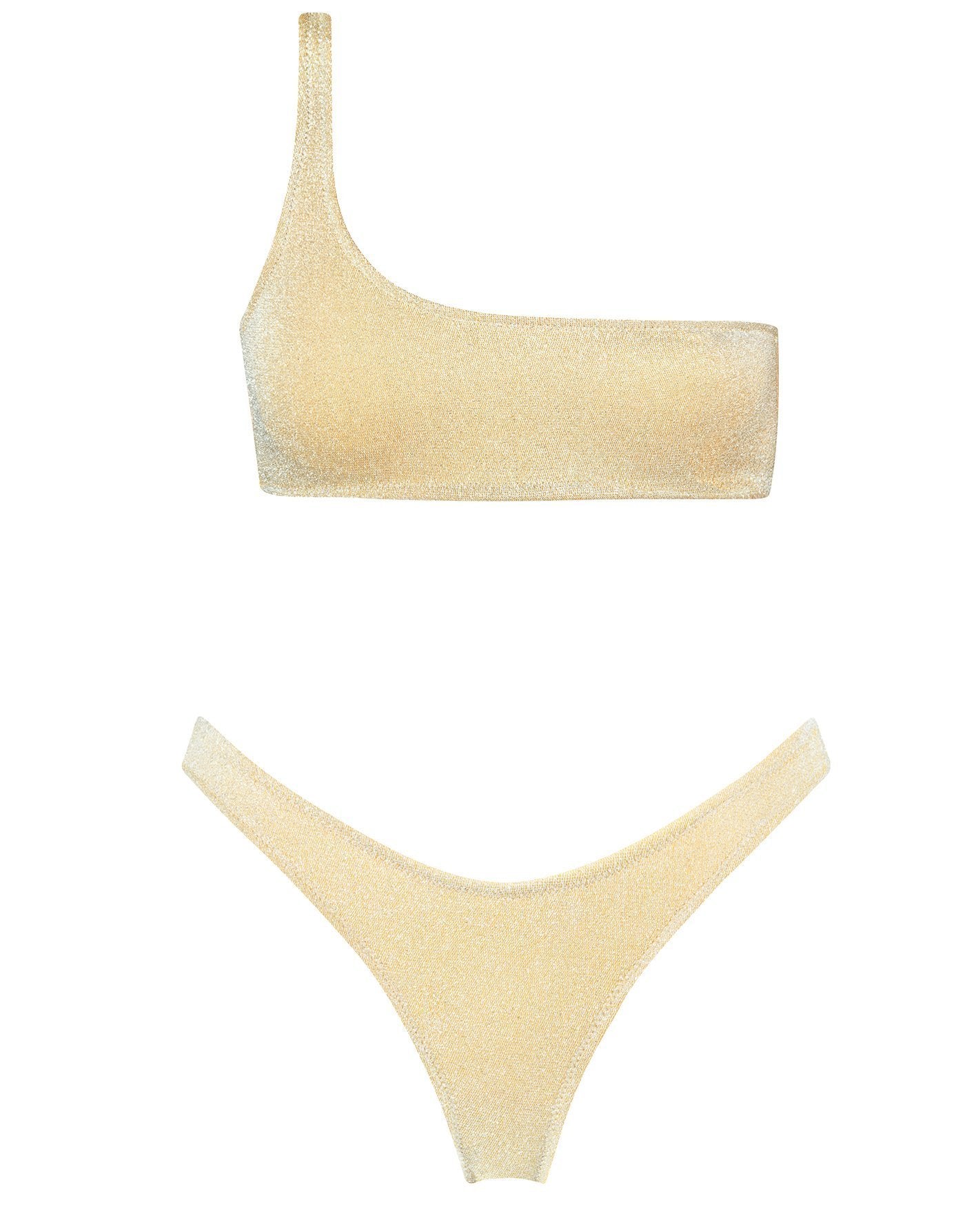 Shiny one shoulder bikini in gold lurex with matching high waist bottoms. This bikini also comes with a gold lurex belt bag.