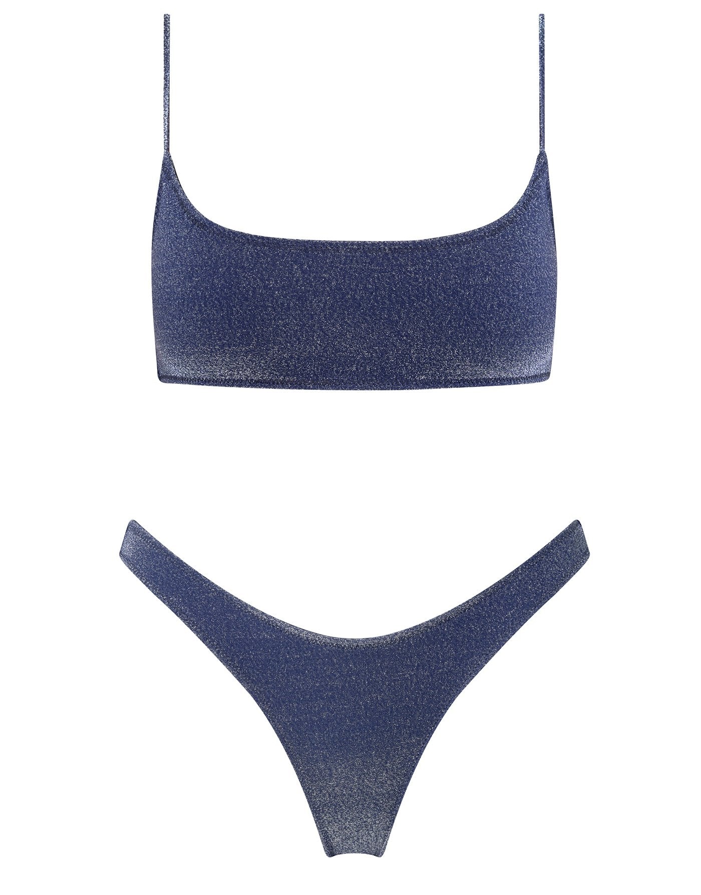 Shiny nylon spandex bikini in midnight blue lurex with matching high waist bottom. Strappy crop top with adjustable shoulder straps and back clasp fastening. Choose from either a cheeky bottom or normal bottom for a little more coverage. This bikini also comes with a matching drawstring dust bag.