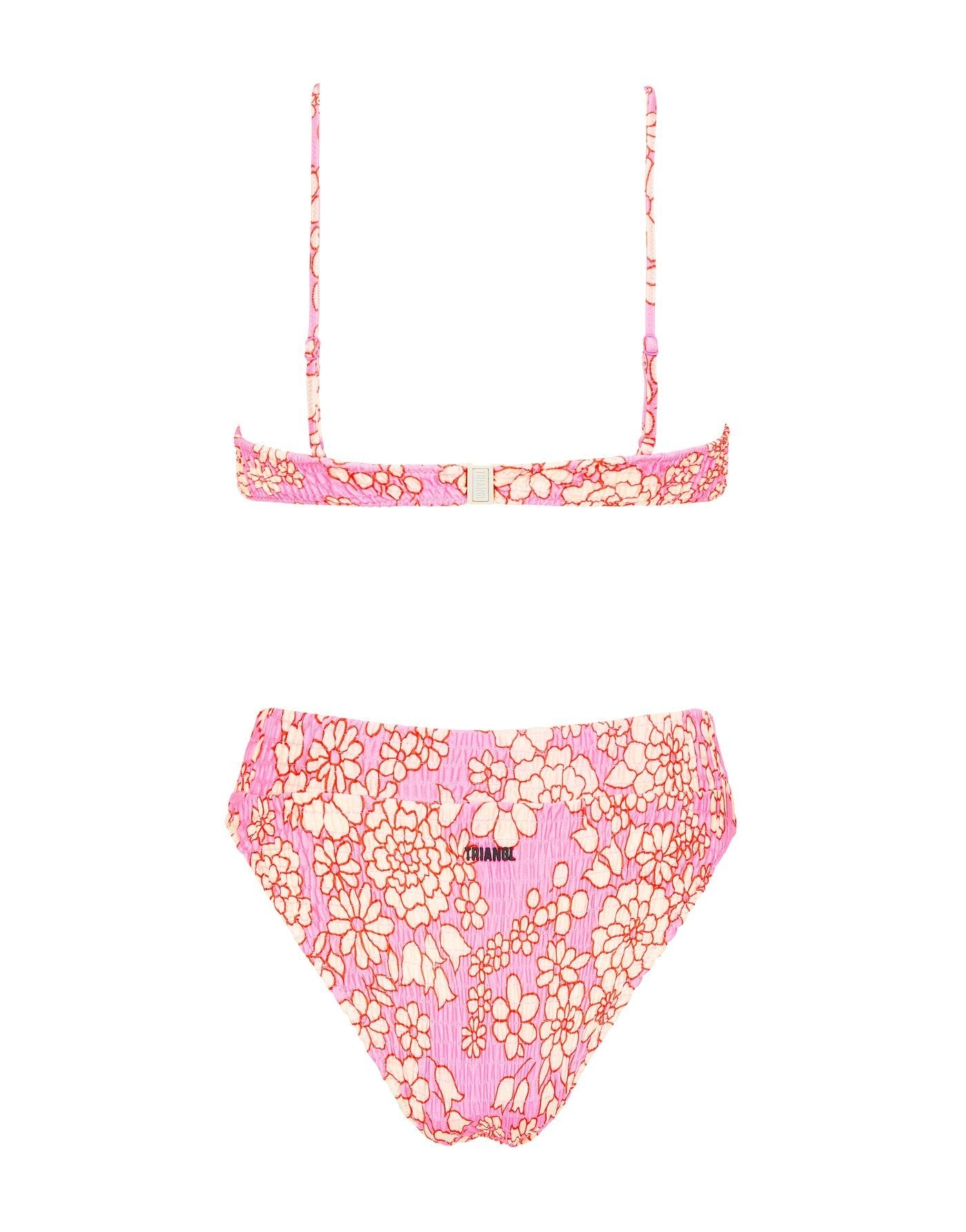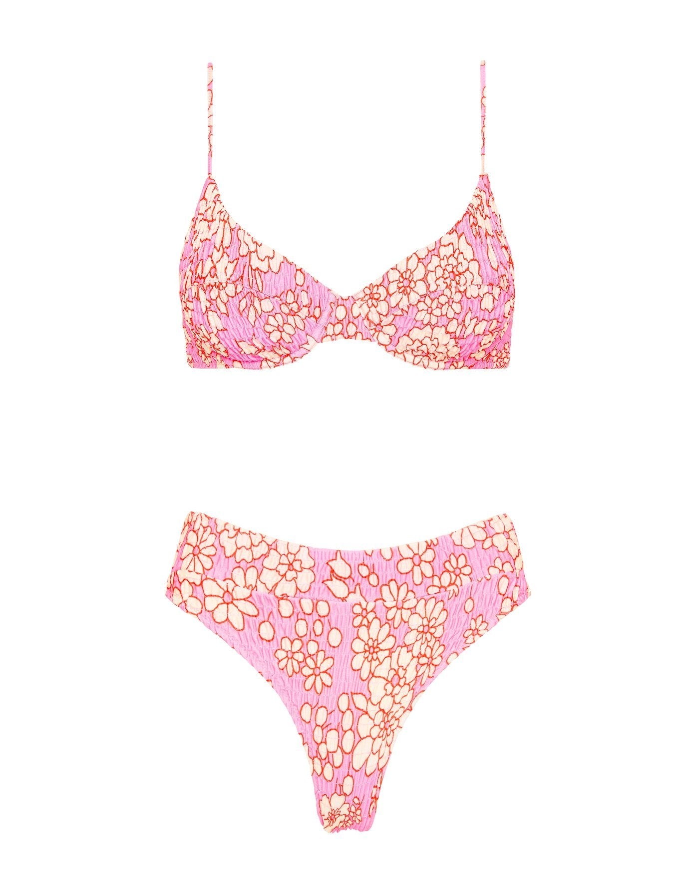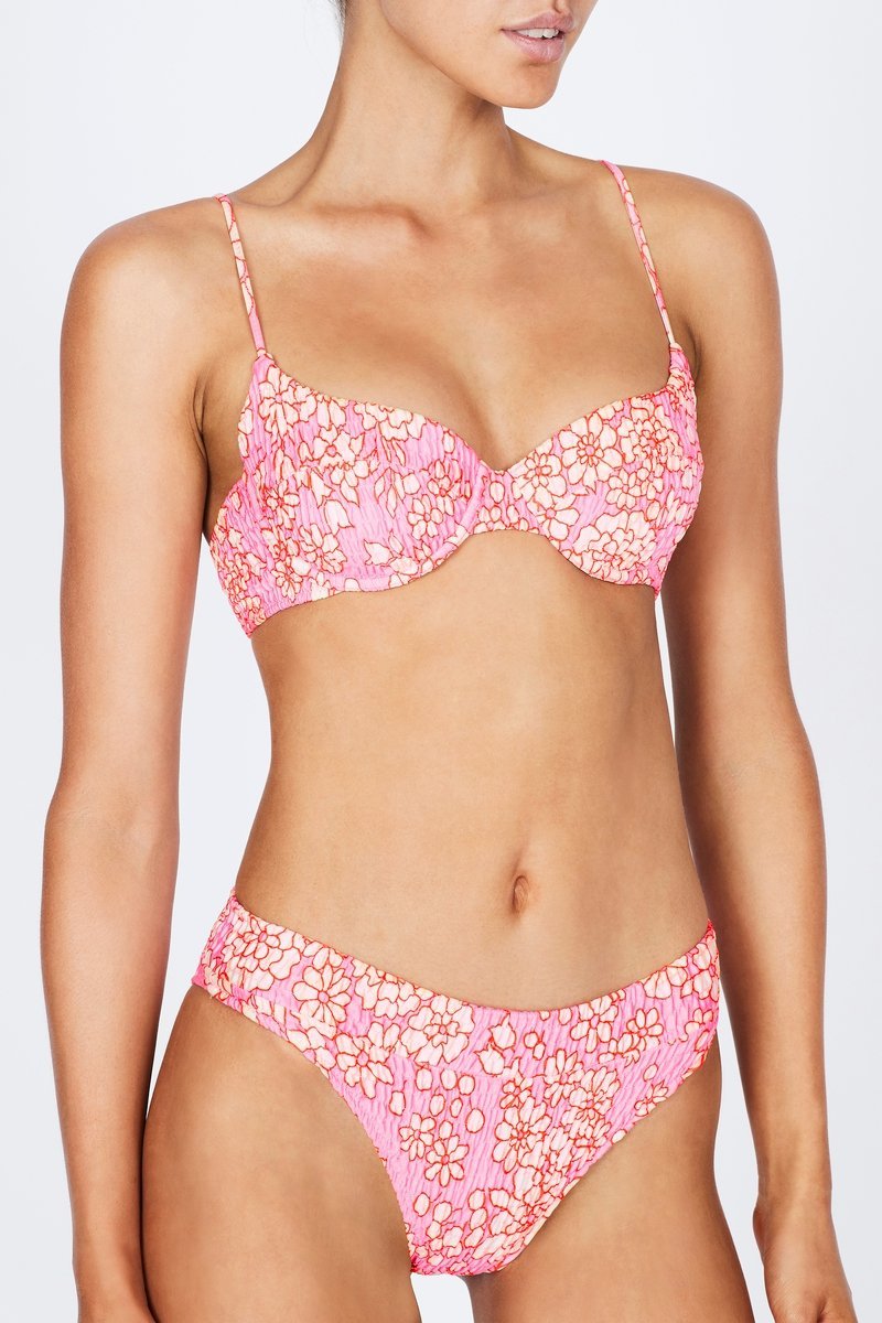 A ruched bra style top with matching high rise bottoms in pink and white floral print. Featuring a padded cup with adjustable shoulder straps and back clasp fastening. The high waist bottom features a wide band that sits close to the waist. This bikini also comes with a matching ruched drawstring dust bag.