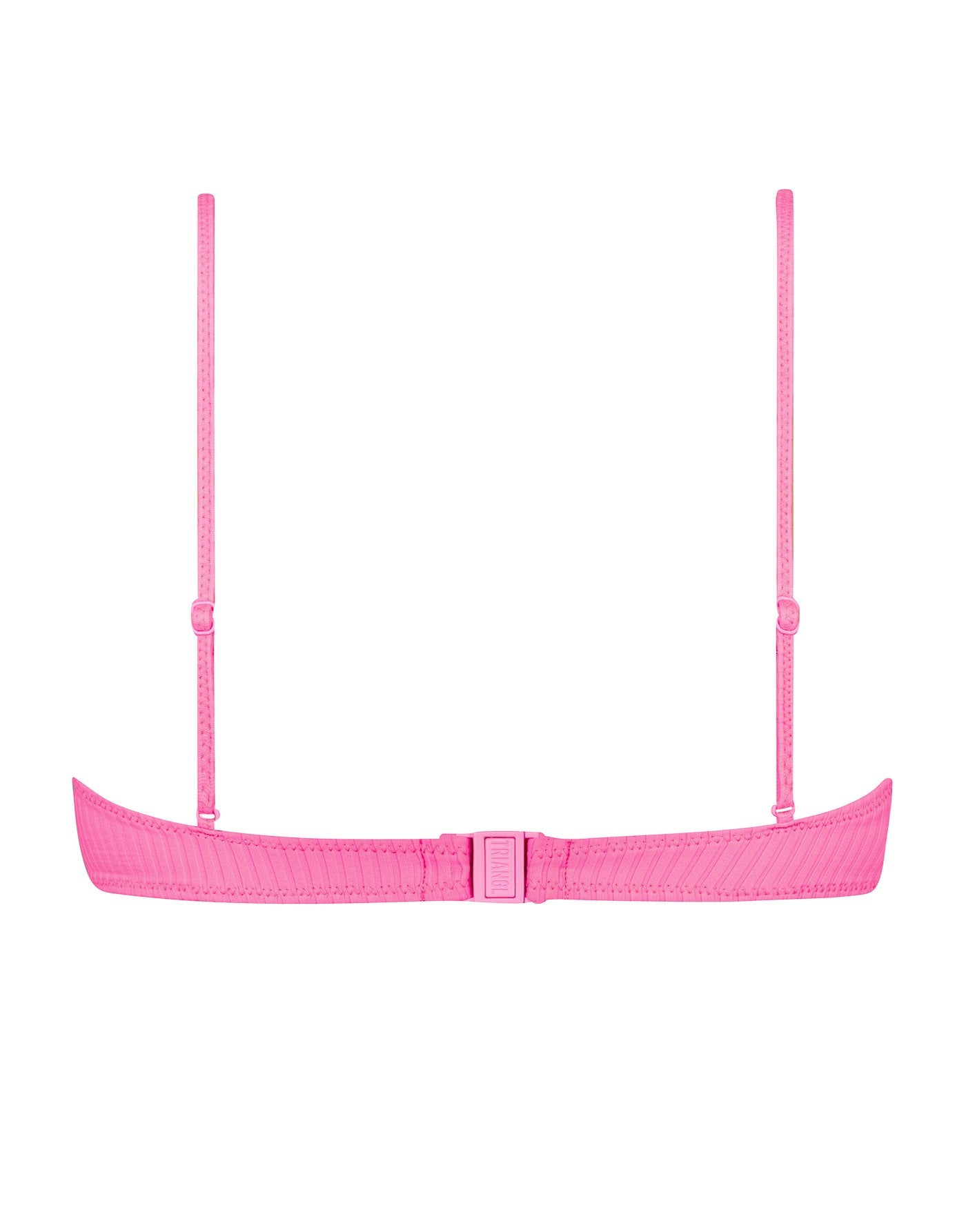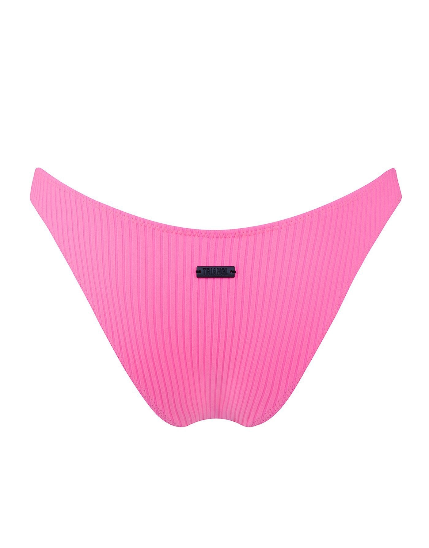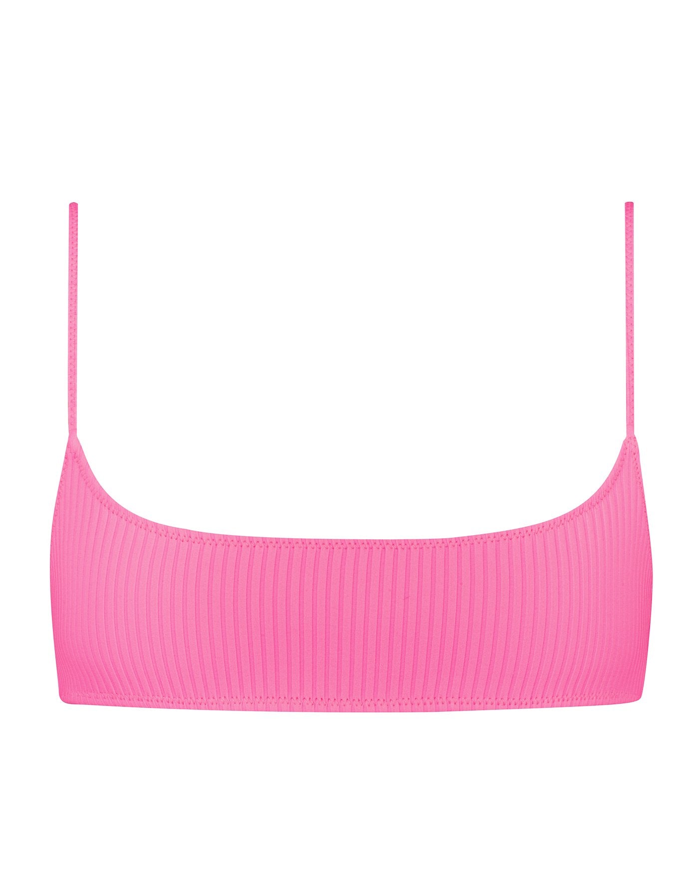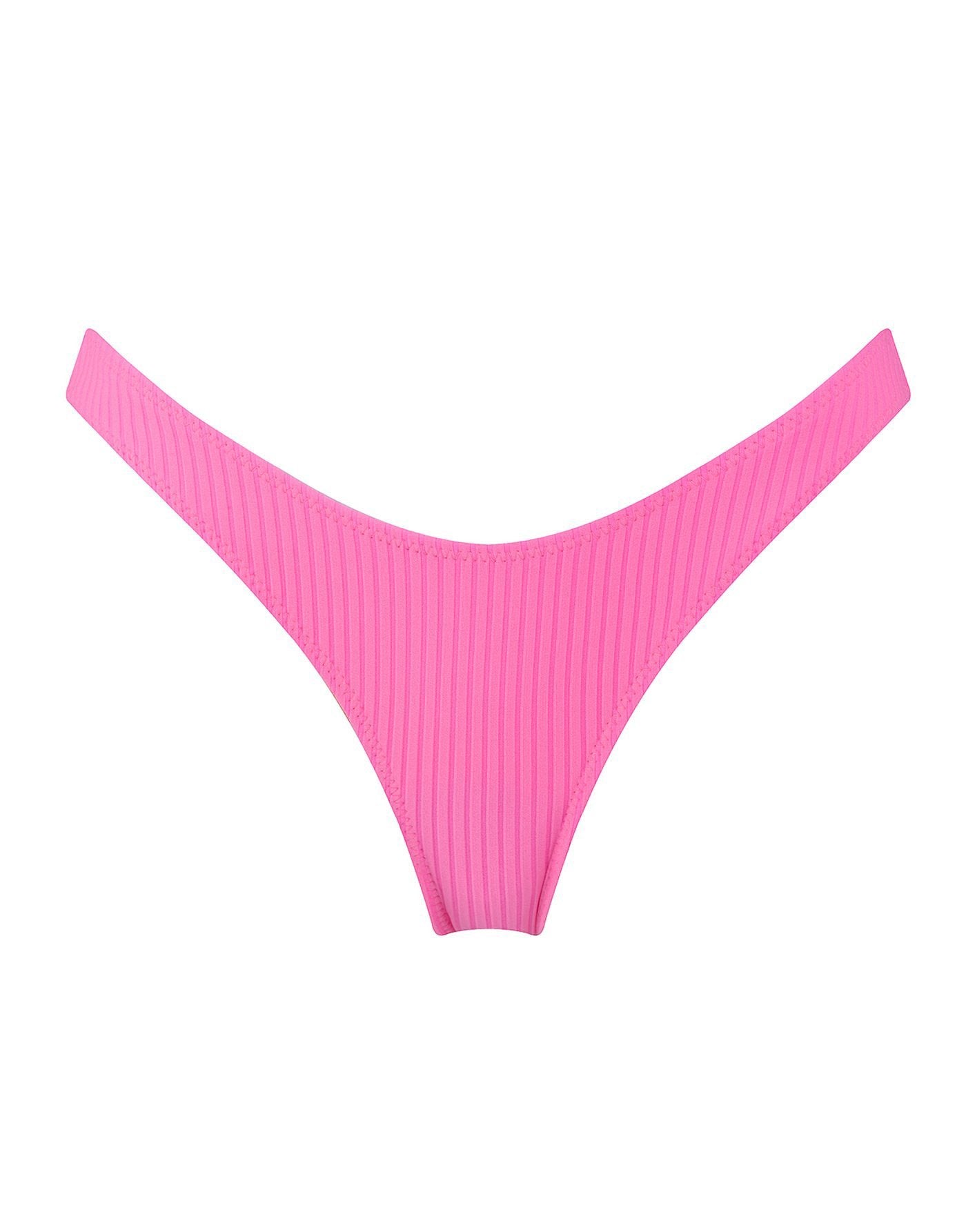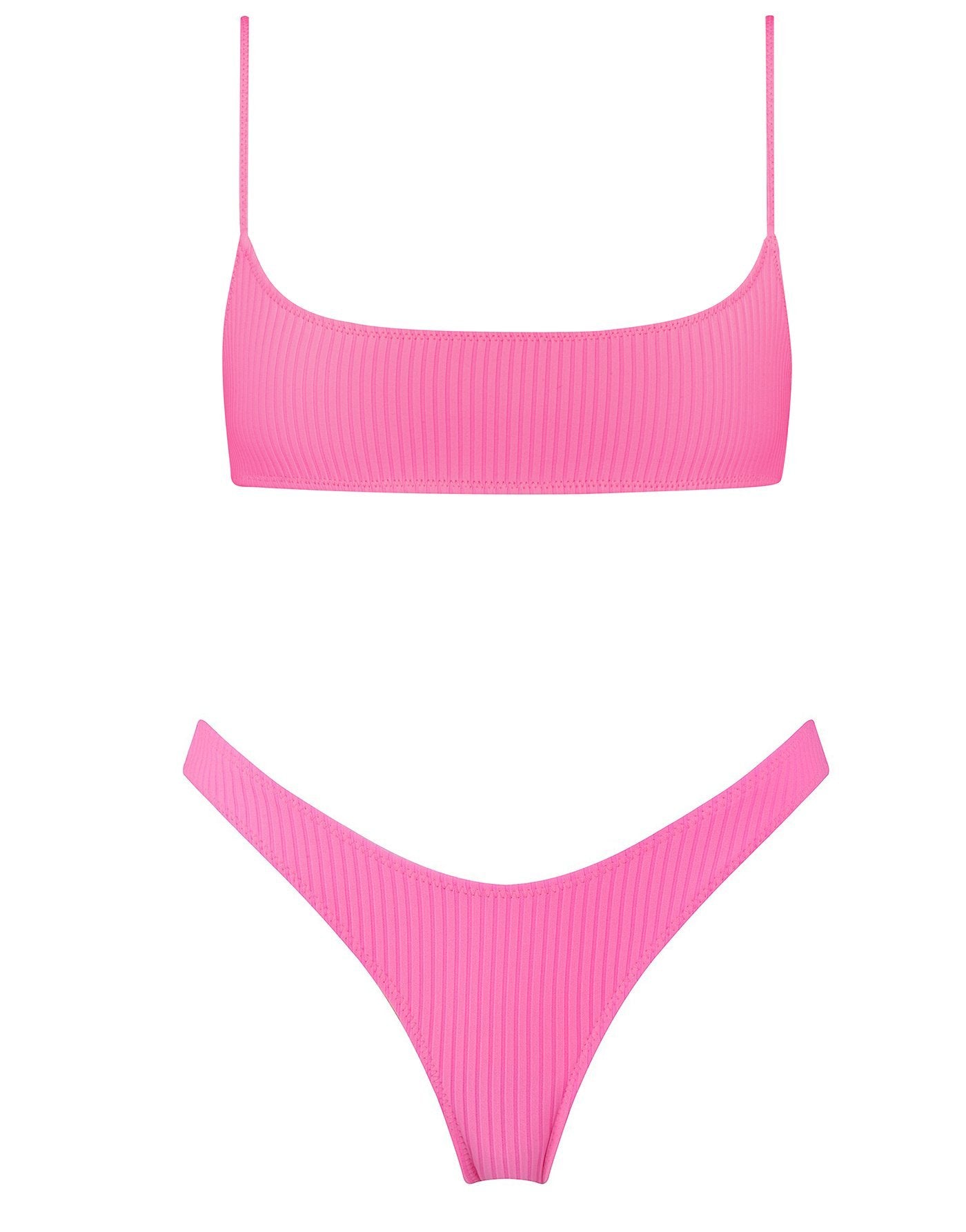 Neon pink super stretch nylon spandex ribbed bikini. Featuring a narrower front crop top with adjustable shoulder straps and back clasp fastening.  Matched with a high waist bottom in either cheeky or normal fit. This bikini also comes with a matching belt bag.