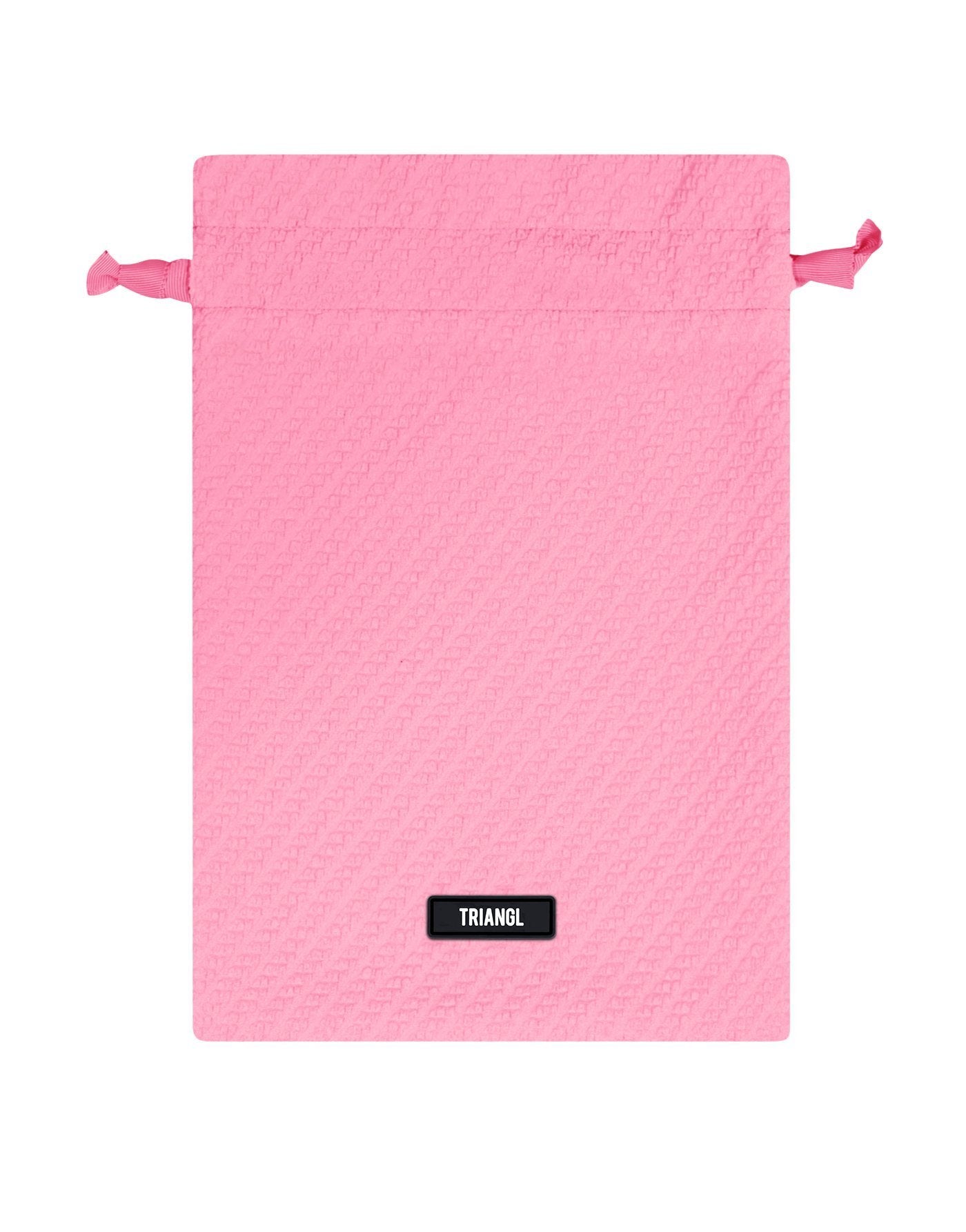 A textured pattern bra style top with matching high waist bottoms in bright pink. Featuring a padded cup with adjustable shoulder straps and back clasp fastening. The high waist bottom features a wide band that sits close to the waist. This bikini also comes with a matching drawstring dust bag.