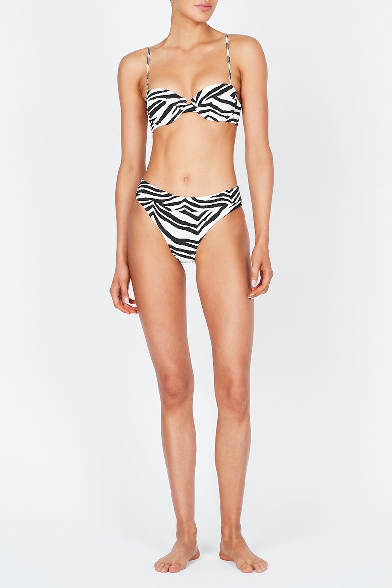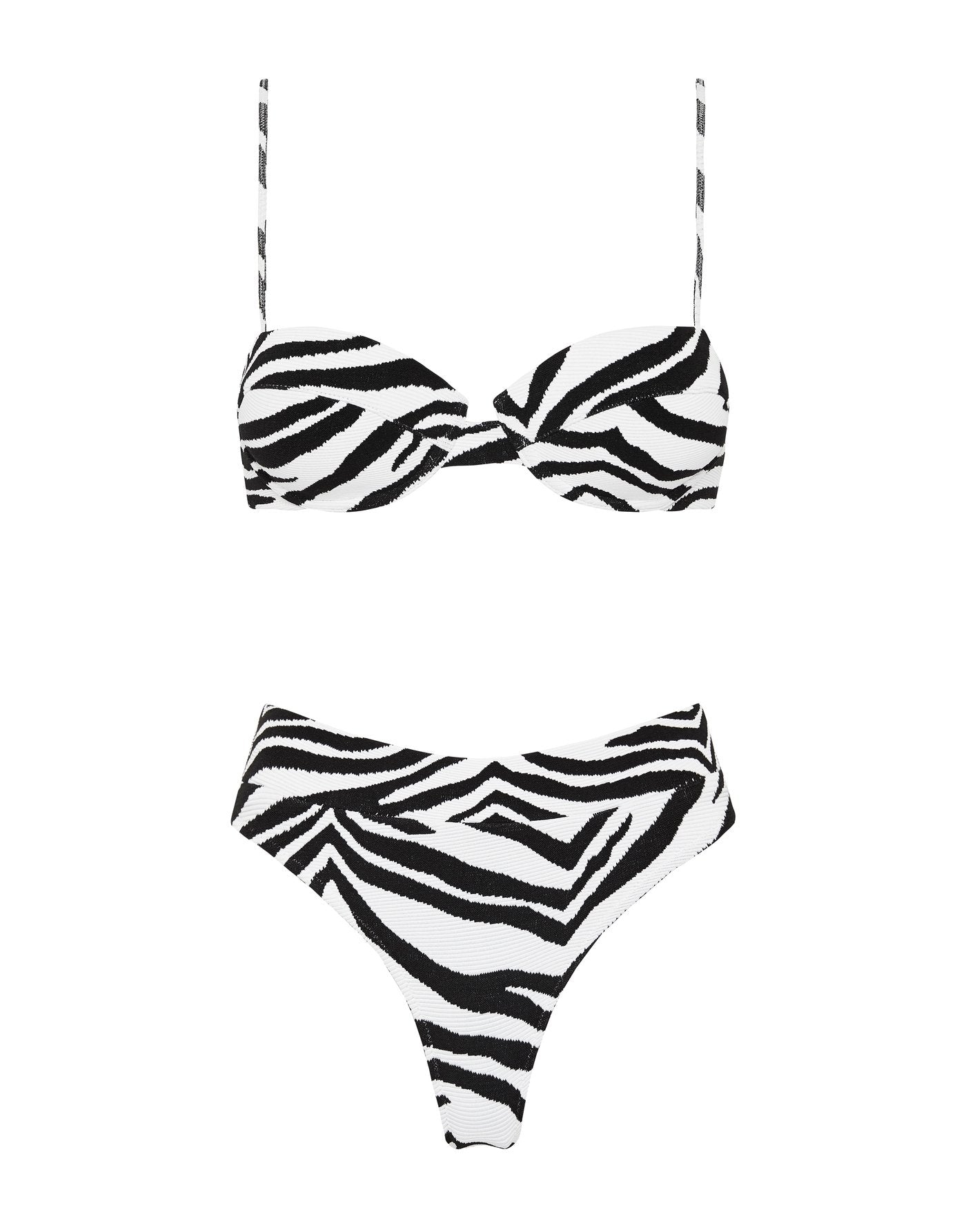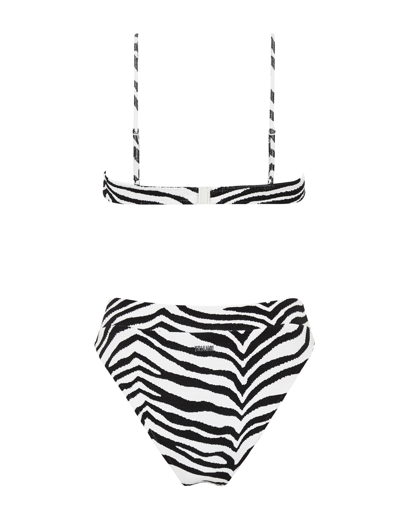 A bra style top with matching high rise bottoms in textured zebra print. Featuring a padded cup with adjustable shoulder straps and back clasp fastening. This bikini also comes with a neoprene drawstring dust bag.