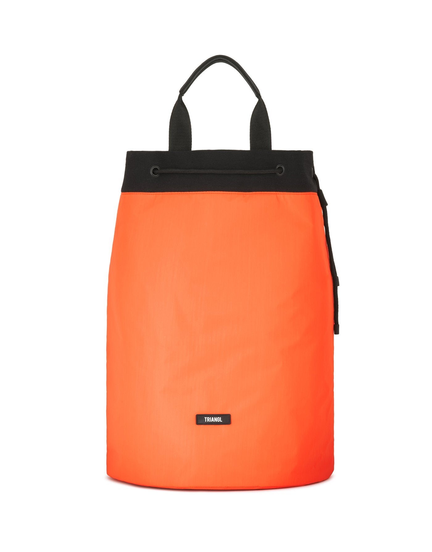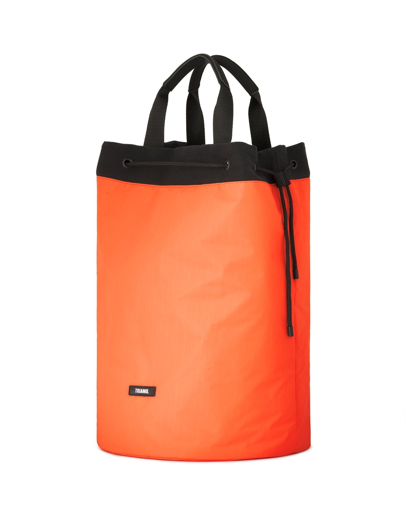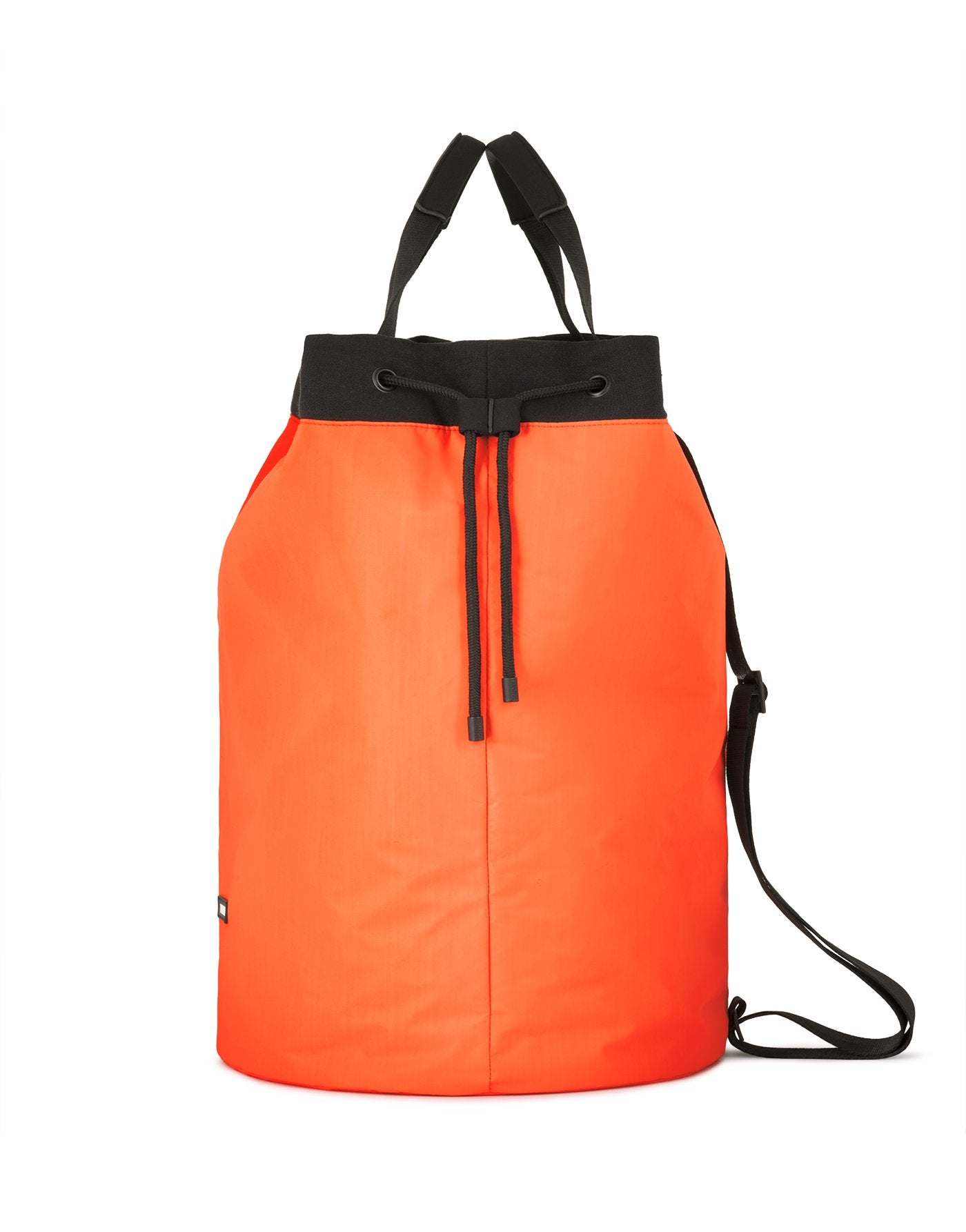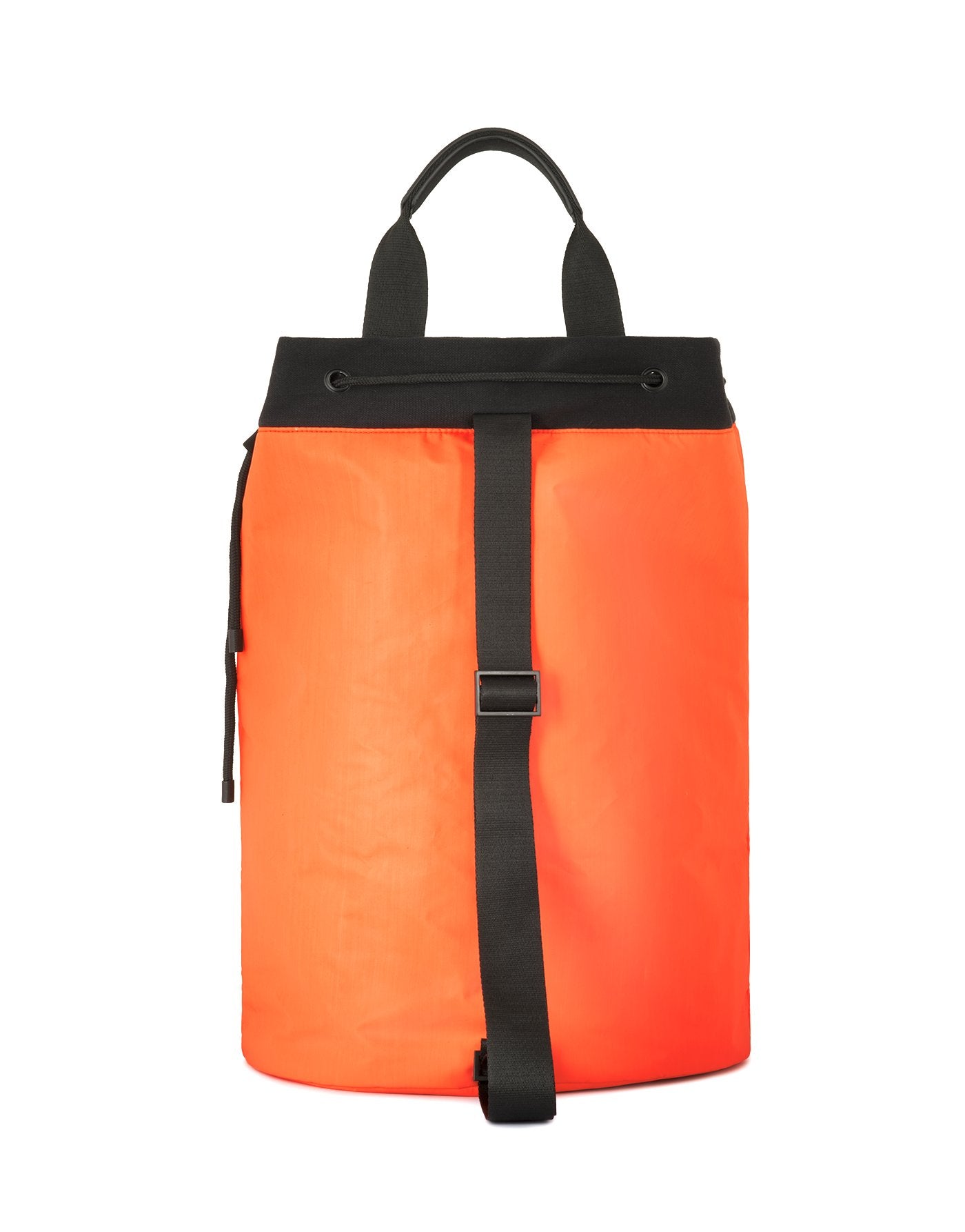 Neon orange bucket backpack. Drawstring closure with twin top handles and adjustable web strap. Rubberized logo applique. Measurements: H 51cm, W 48cm, D 48cm.
