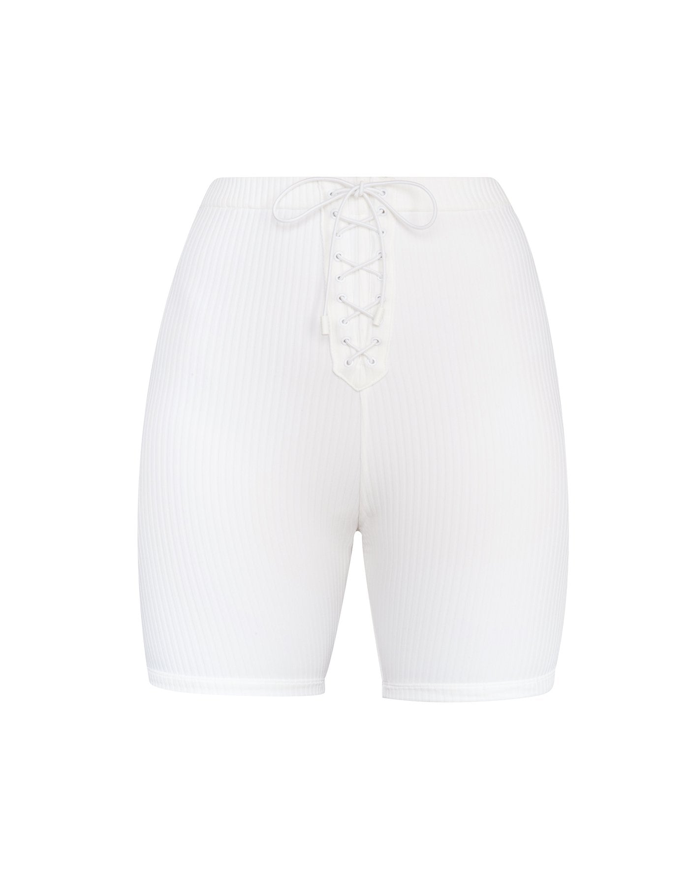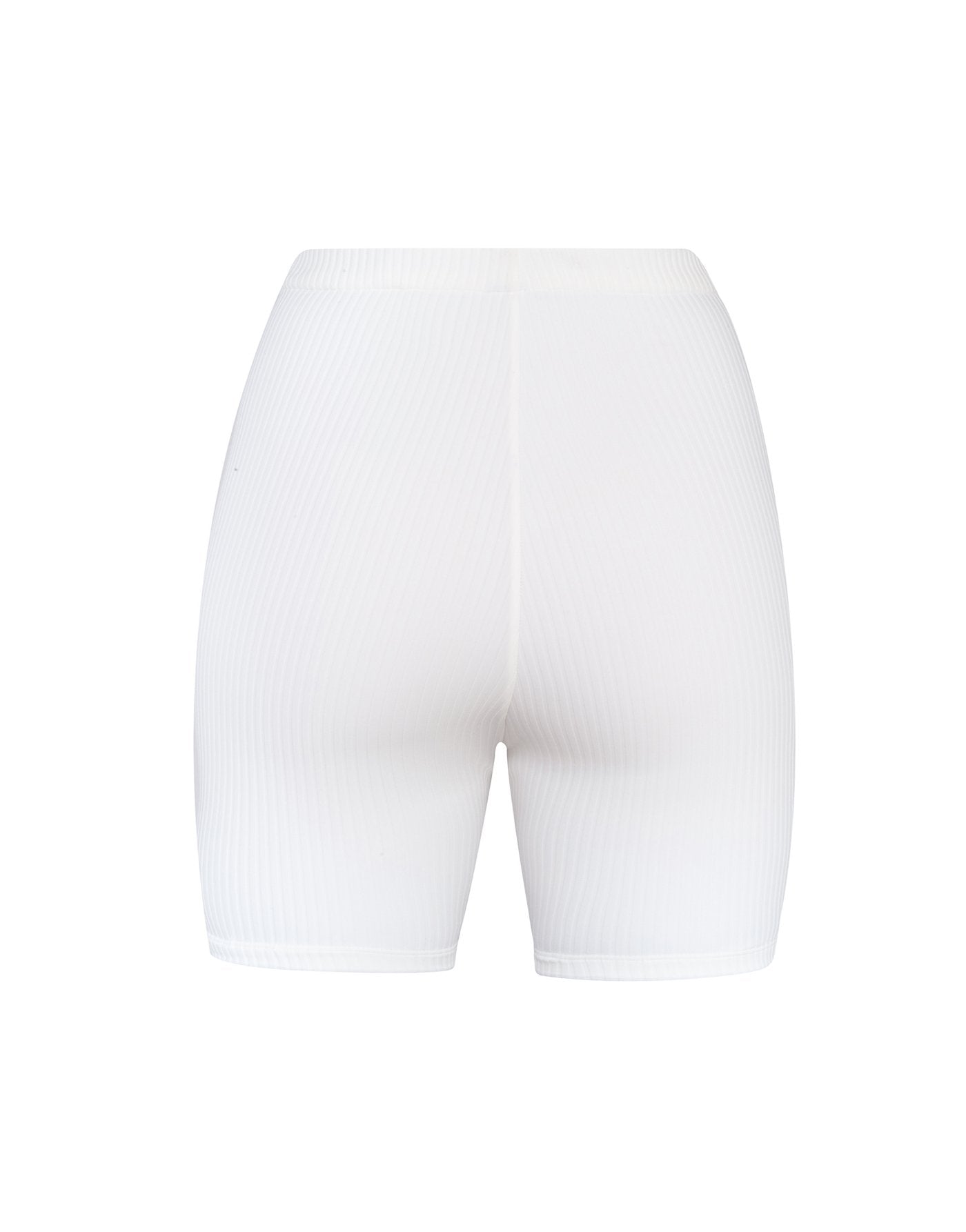 High rise bike pants in white rib. Featuring a corset drawstring closure and mid length legs.