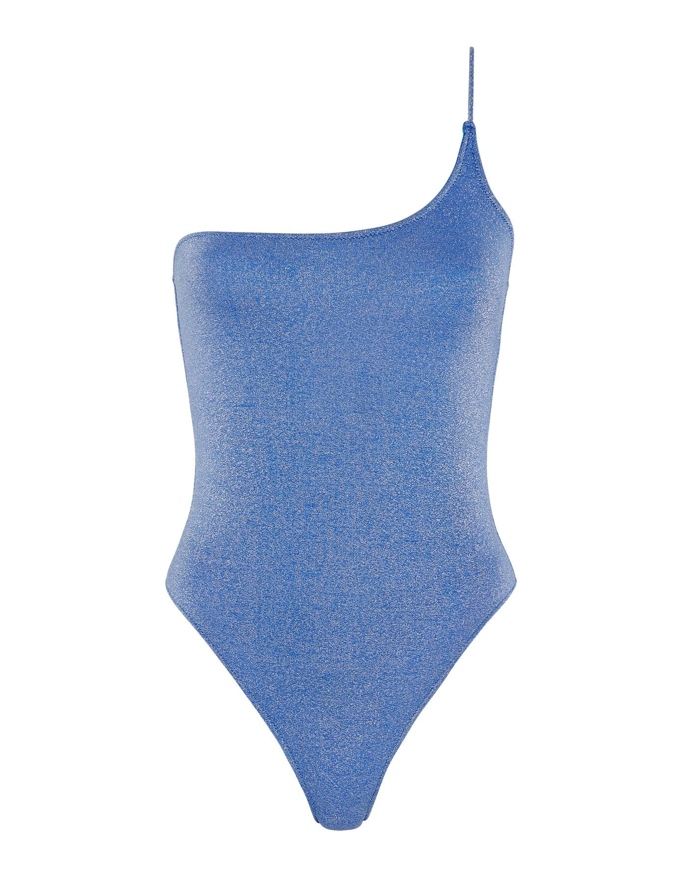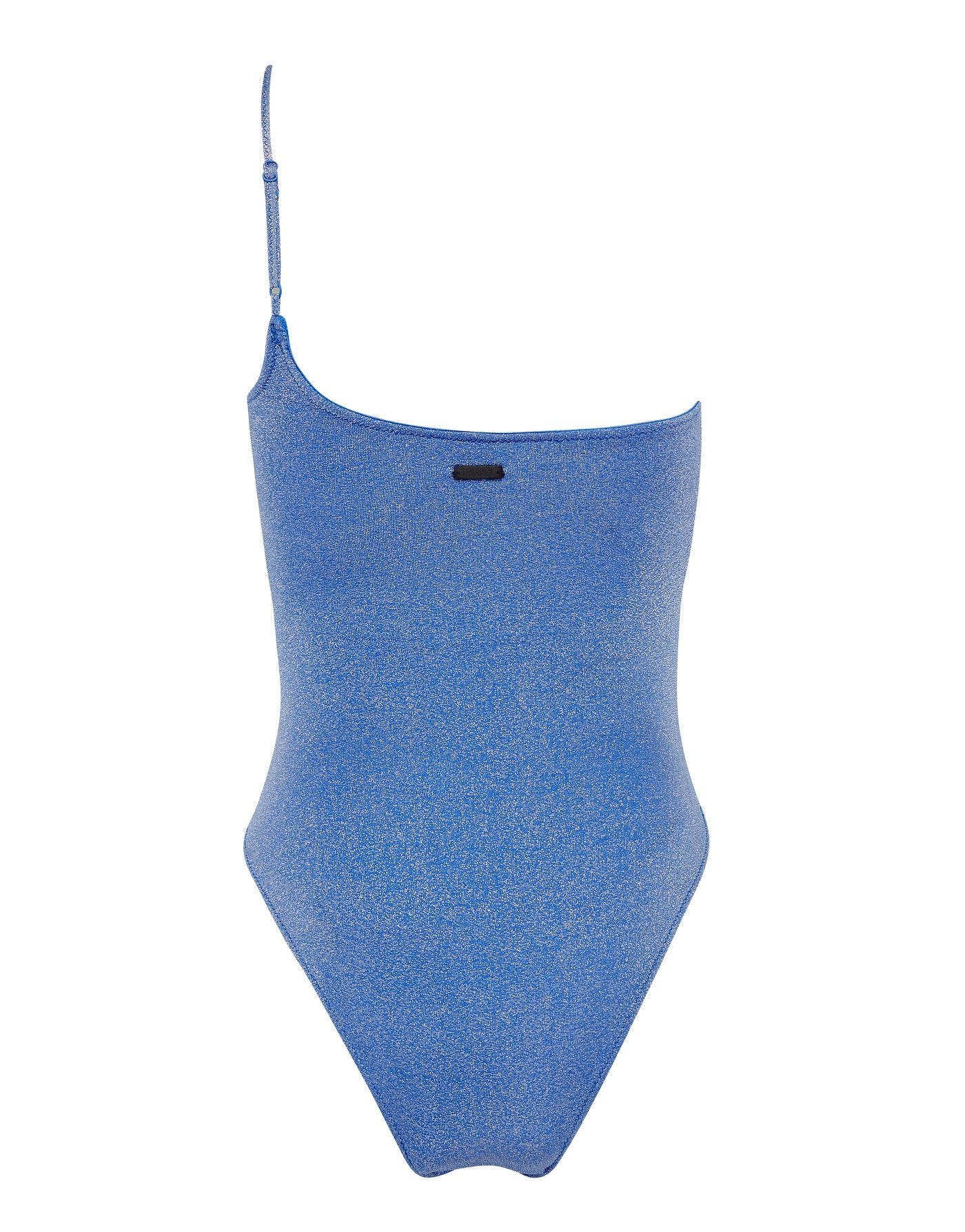 Sparkle lurex one shoulder swimsuit in blue. Featuring high cut sides and an adjustable one shoulder design. This swimsuit also comes in a matching color drawstring dust bag.