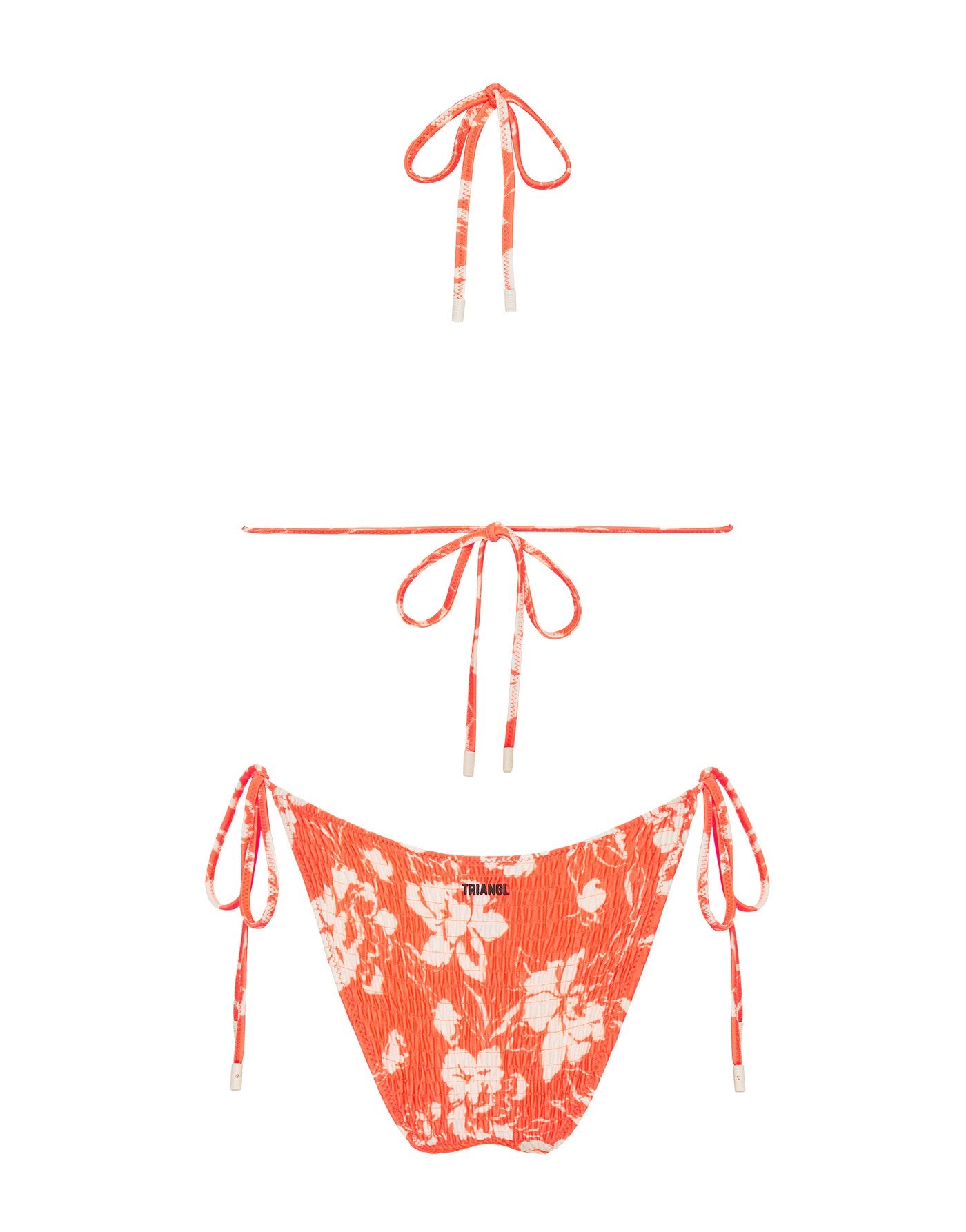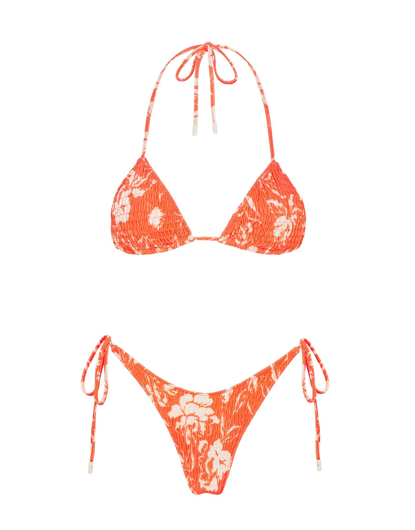 A textured side-tie bikini in floral. Fully adjustable triangle top and bottoms with self-tie fastenings. This bikini also comes with a matching drawstring dust bag.