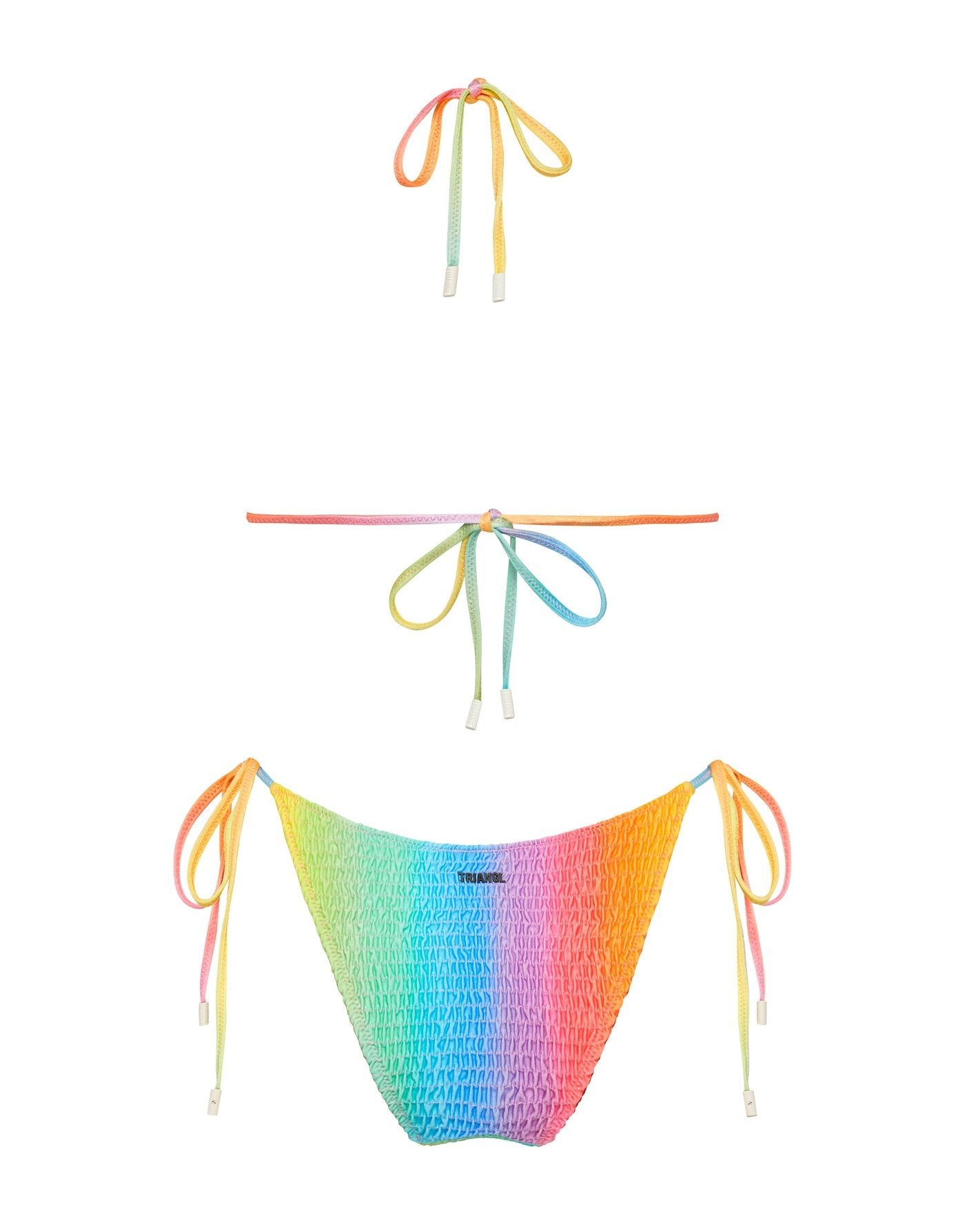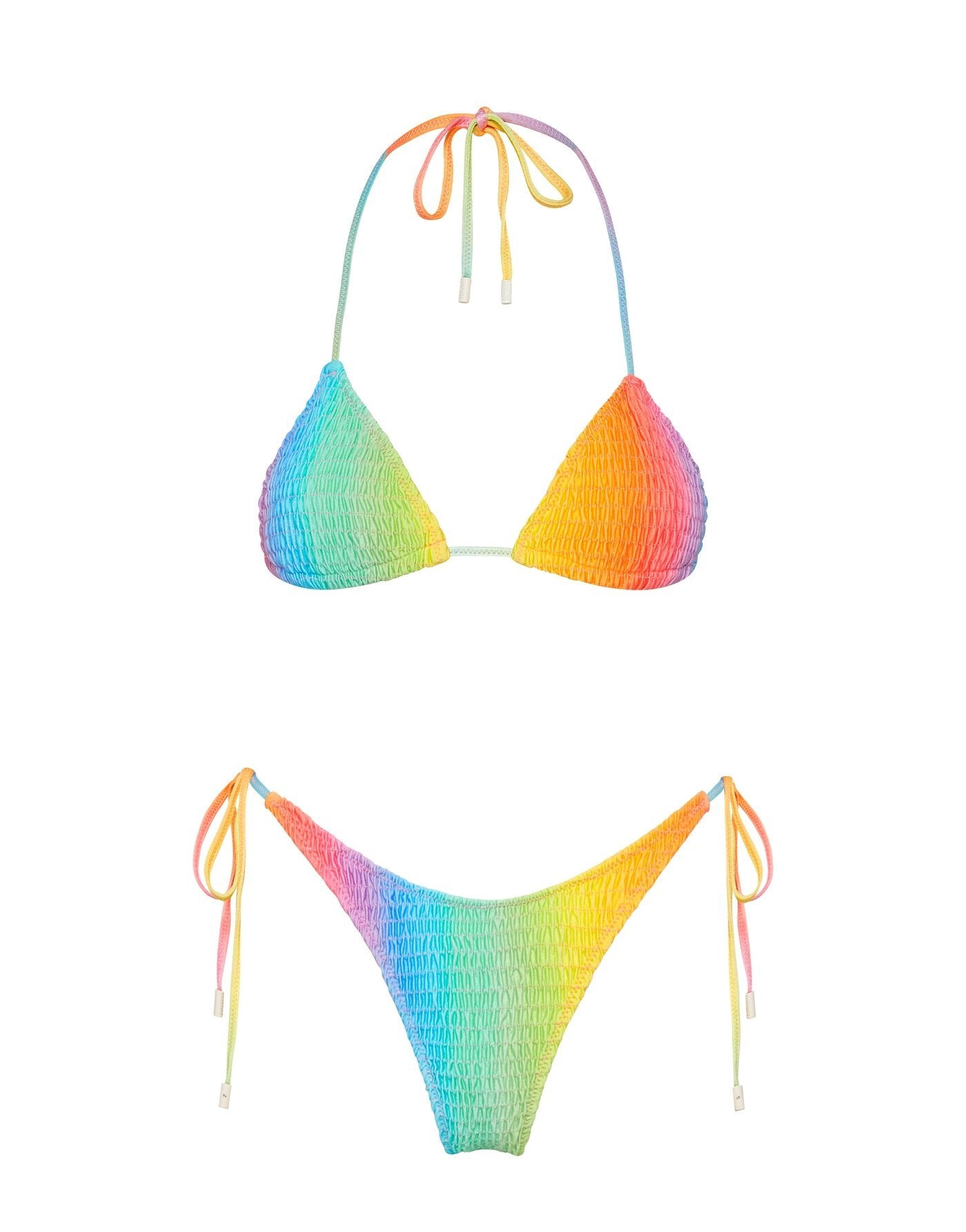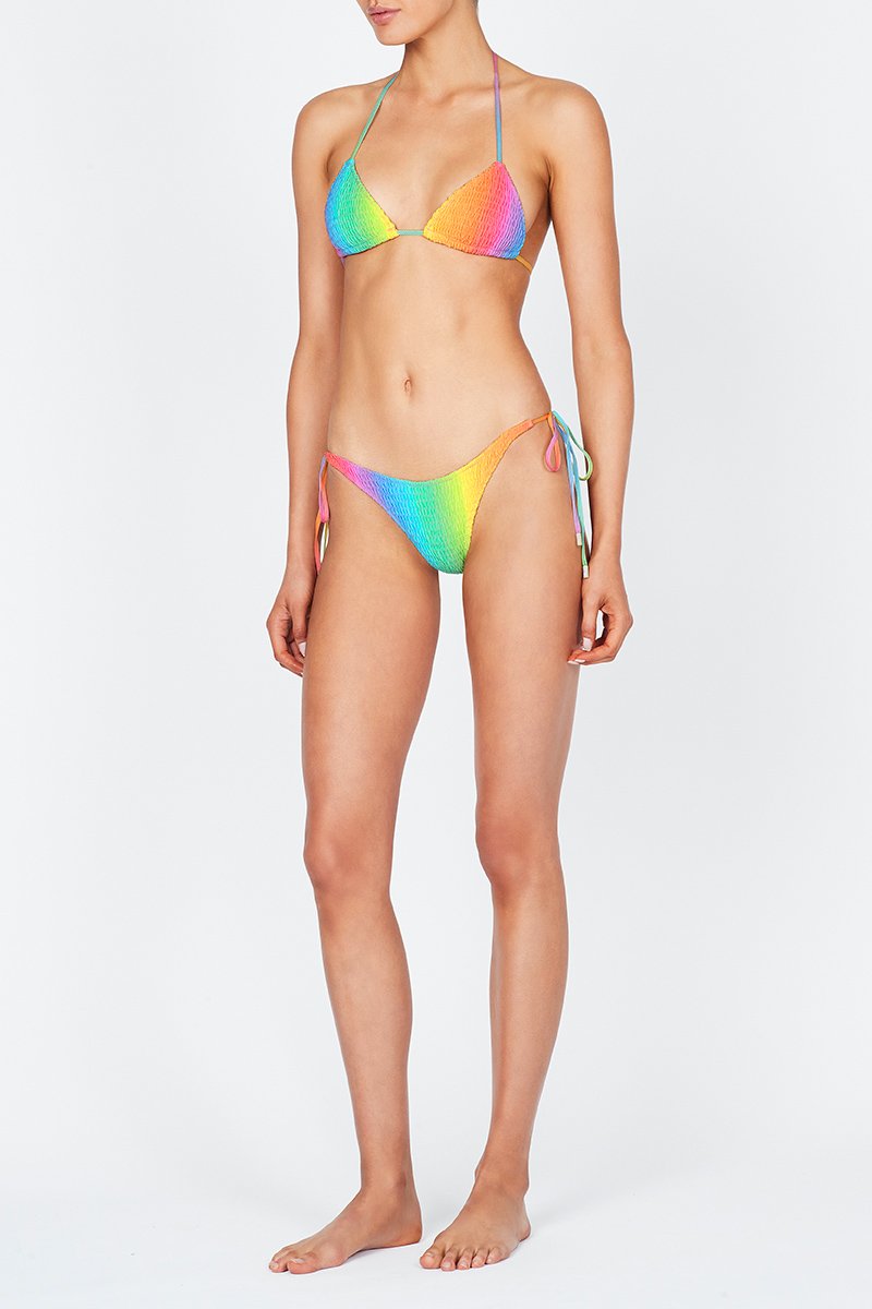 A textured side-tie bikini in rainbow. Fully adjustable triangle top and bottoms with self-tie fastenings. This bikini also comes with a matching drawstring dust bag.
