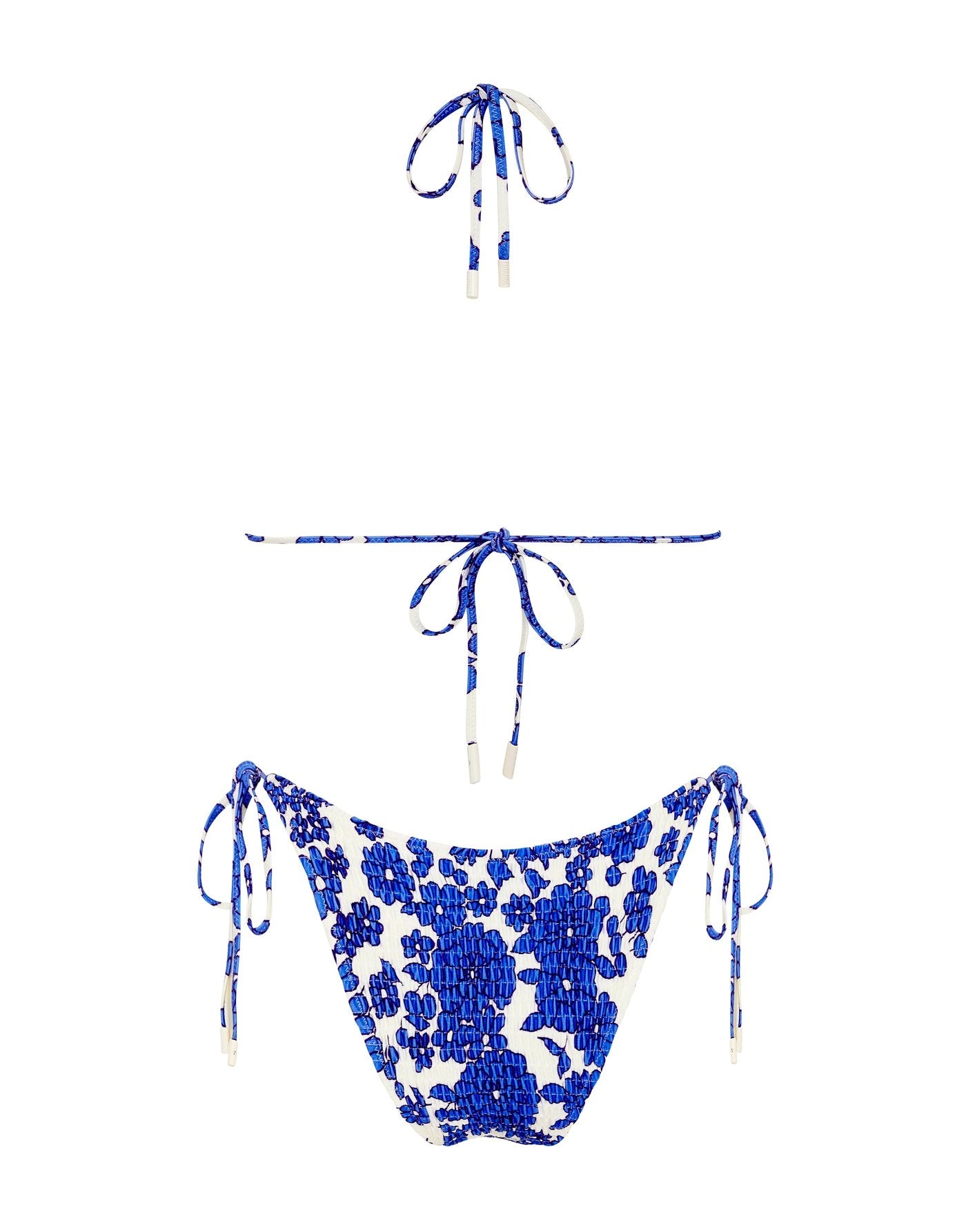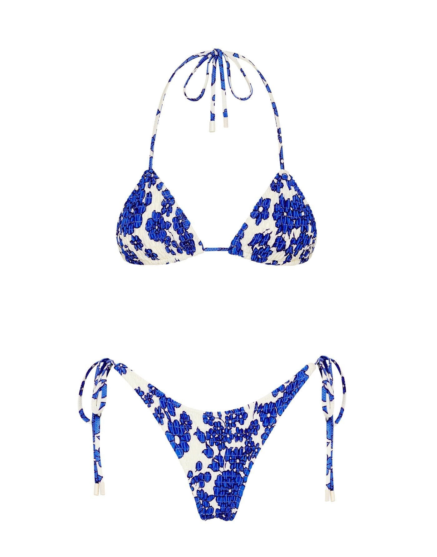A textured side-tie bikini in blue and white floral. Fully adjustable triangle top and bottoms with self-tie fastenings. This bikini also comes with a matching drawstring dust bag.