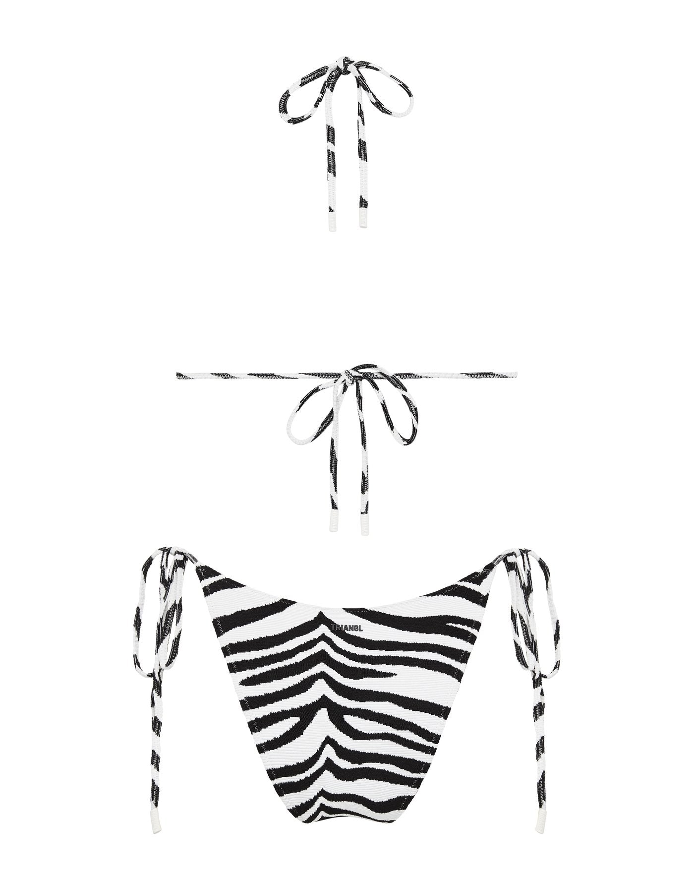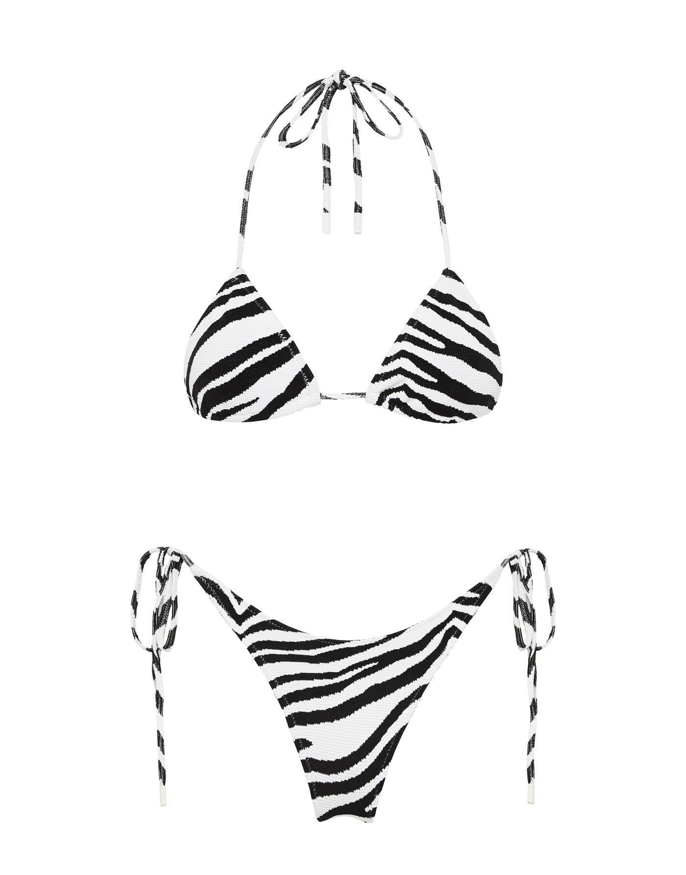 A textured side-tie bikini in zebra print. Fully adjustable triangle top and bottoms with self-tie fastenings. This bikini also comes with a neoprene drawstring dust bag.