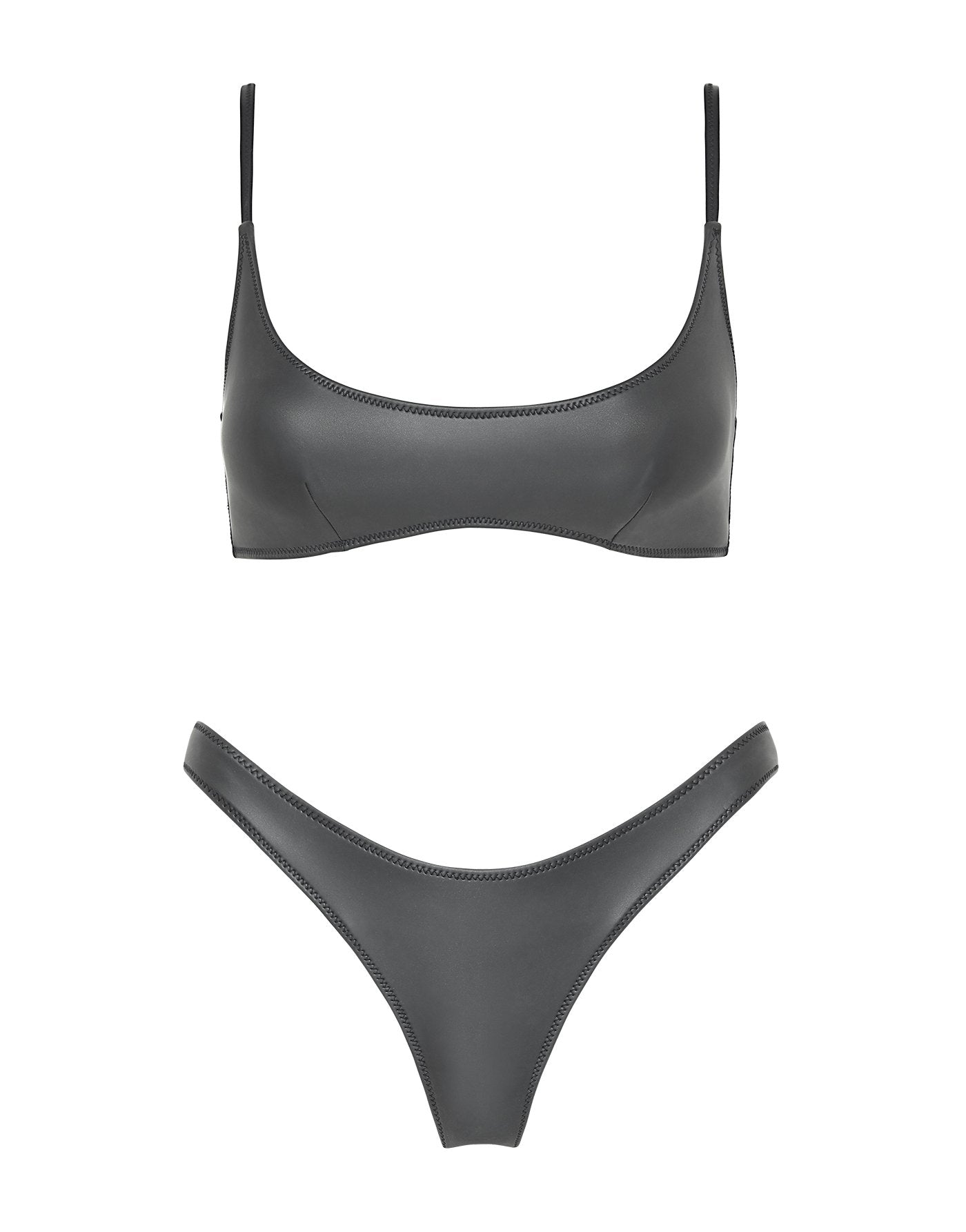 A neoprene  scoop crop bikini top in black with matching high waist bottoms. Strappy crop top with adjustable shoulder straps and back clasp fastening. Choose from either a cheeky bottom or normal bottom for a little more coverage. This bikini also comes with a matching textured drawstring dust bag.